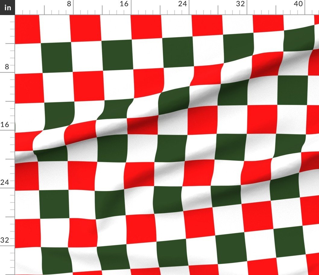 A bold Christmas checkered fabric with vibrant red, green, and white squares, ideal for holiday crafts, fabric projects, and home decor.