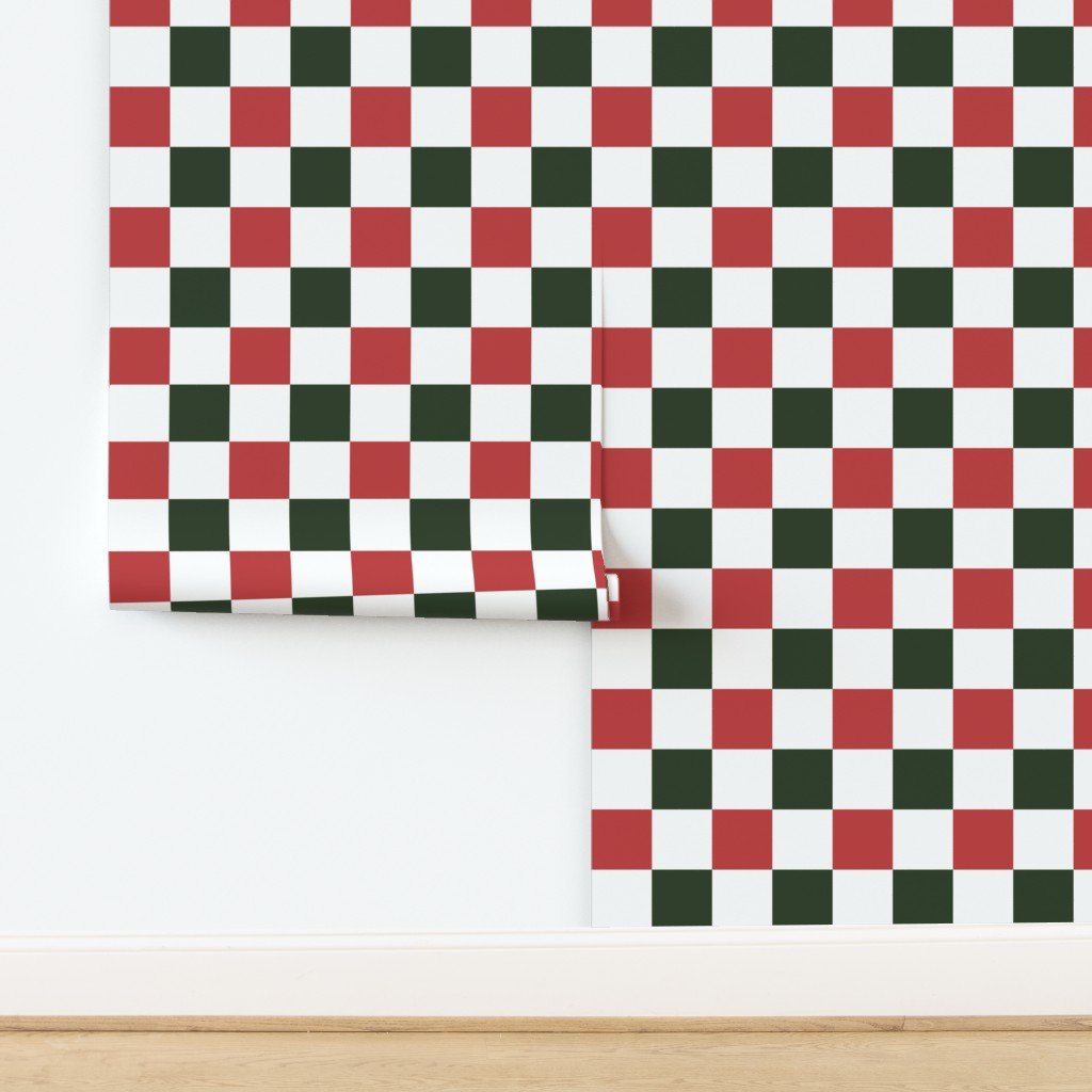 A vintage-inspired Christmas checkered fabric with cranberry red, dark green, and white squares, perfect for seasonal crafts and home decor.