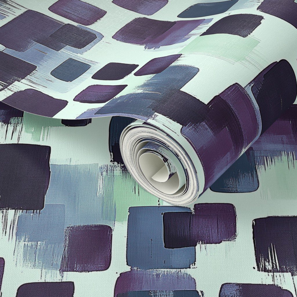 An abstract pattern with bold brushstroke blocks in deep purple and teal on a soft cream background, perfect for contemporary decor.