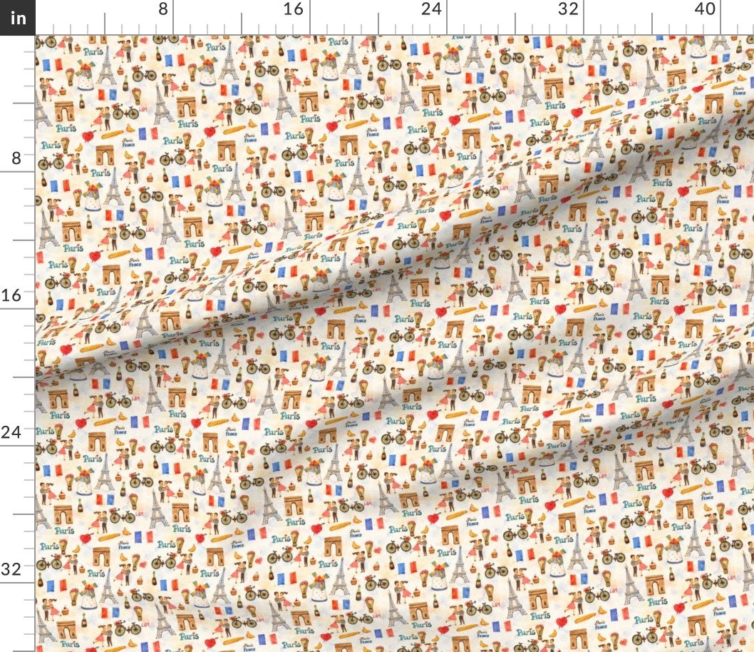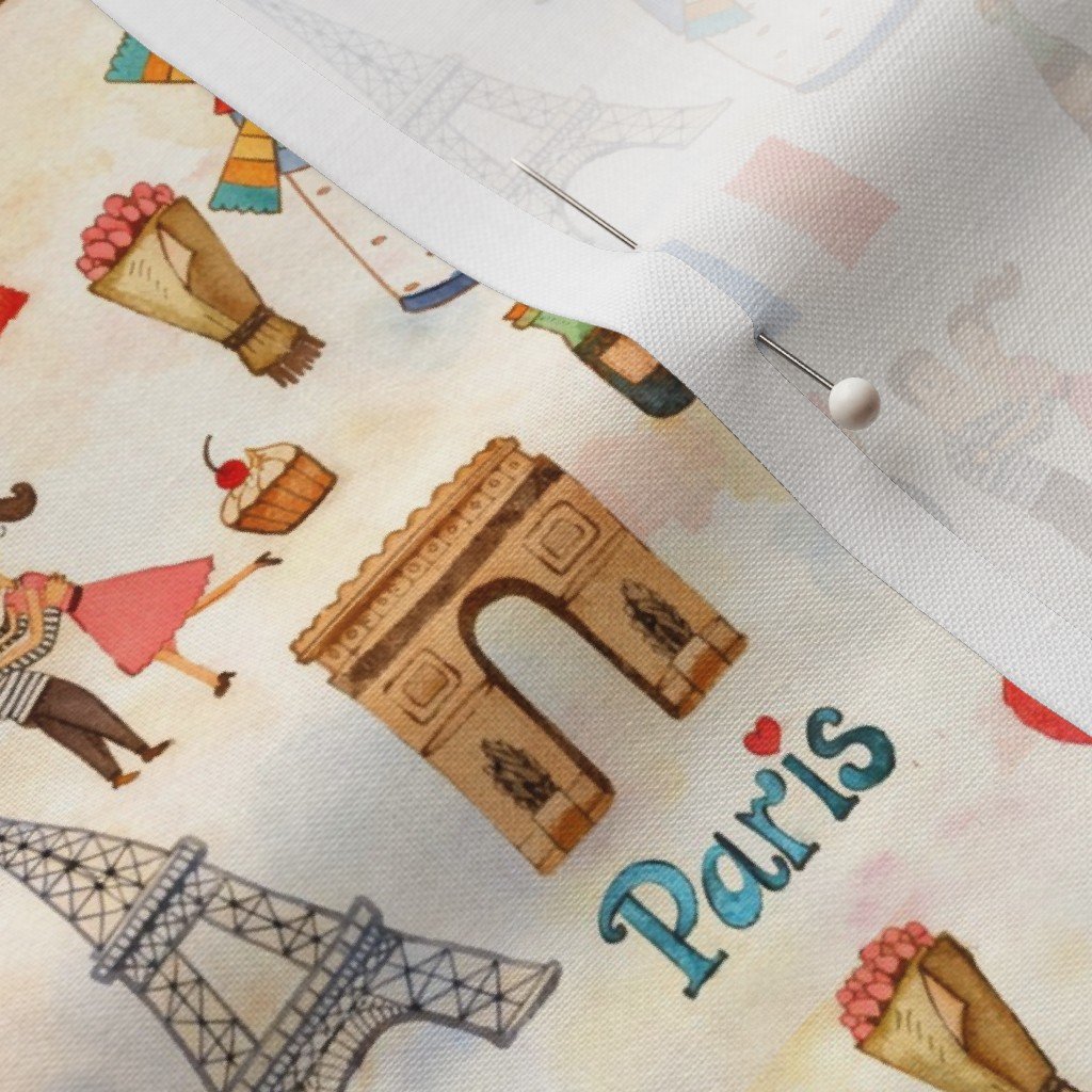 Adorable and whimsical hand-drawn watercolor motifs celebrating Paris, the City of Light. Featuring the Eiffel Tower, Arc de Triomphe, baguettes, bicycles, couples, flags, and classic French symbols in a soft, playful repeat. Perfect for fabric, wallpaper