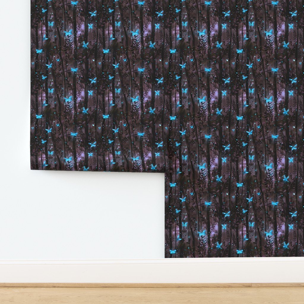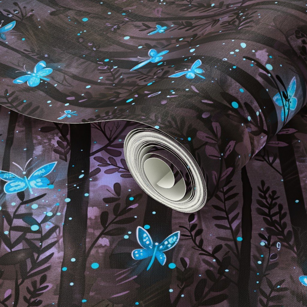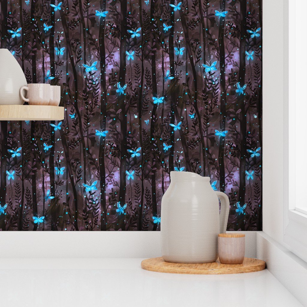 This enchanting pattern showcases a mystical forest bathed in the aqua glow of fireflies and butterflies.