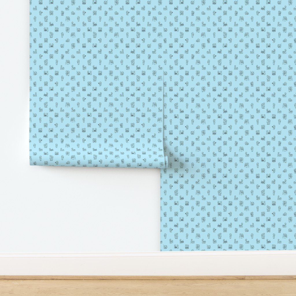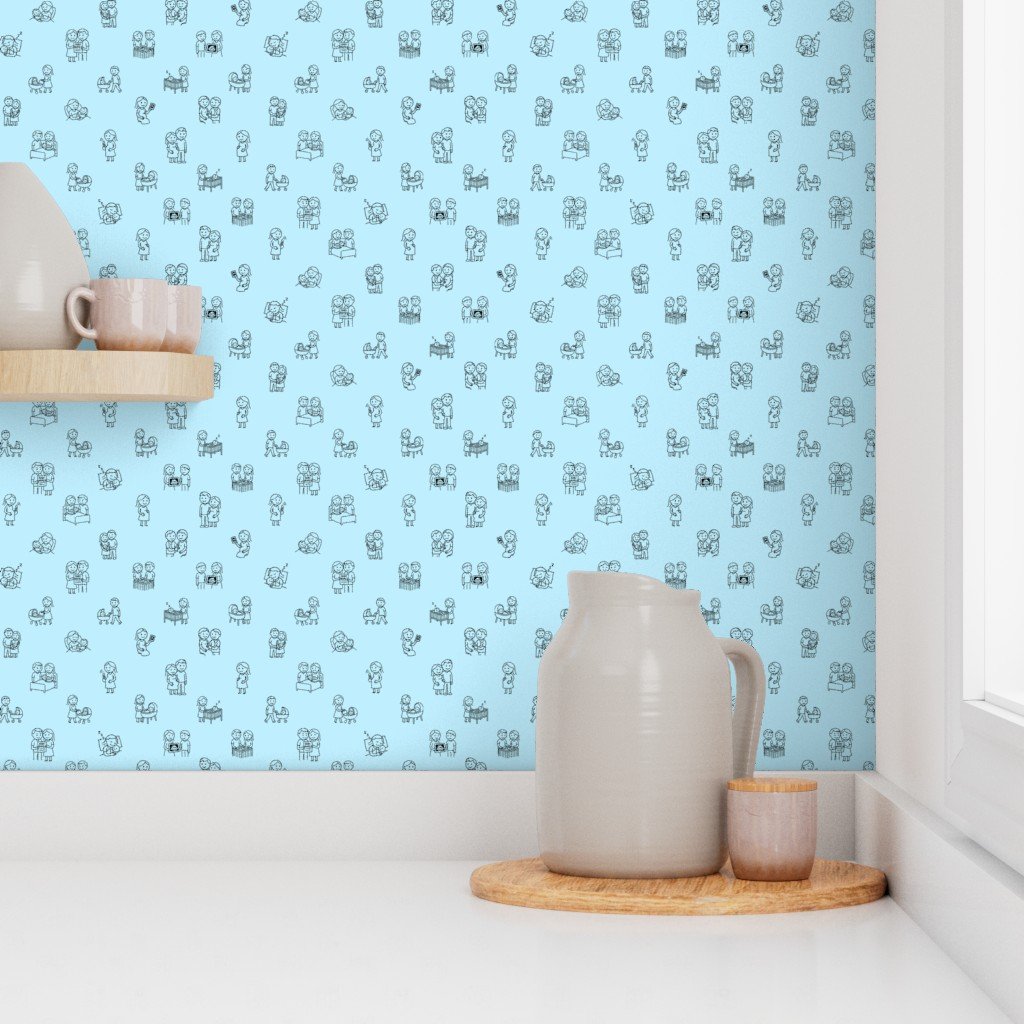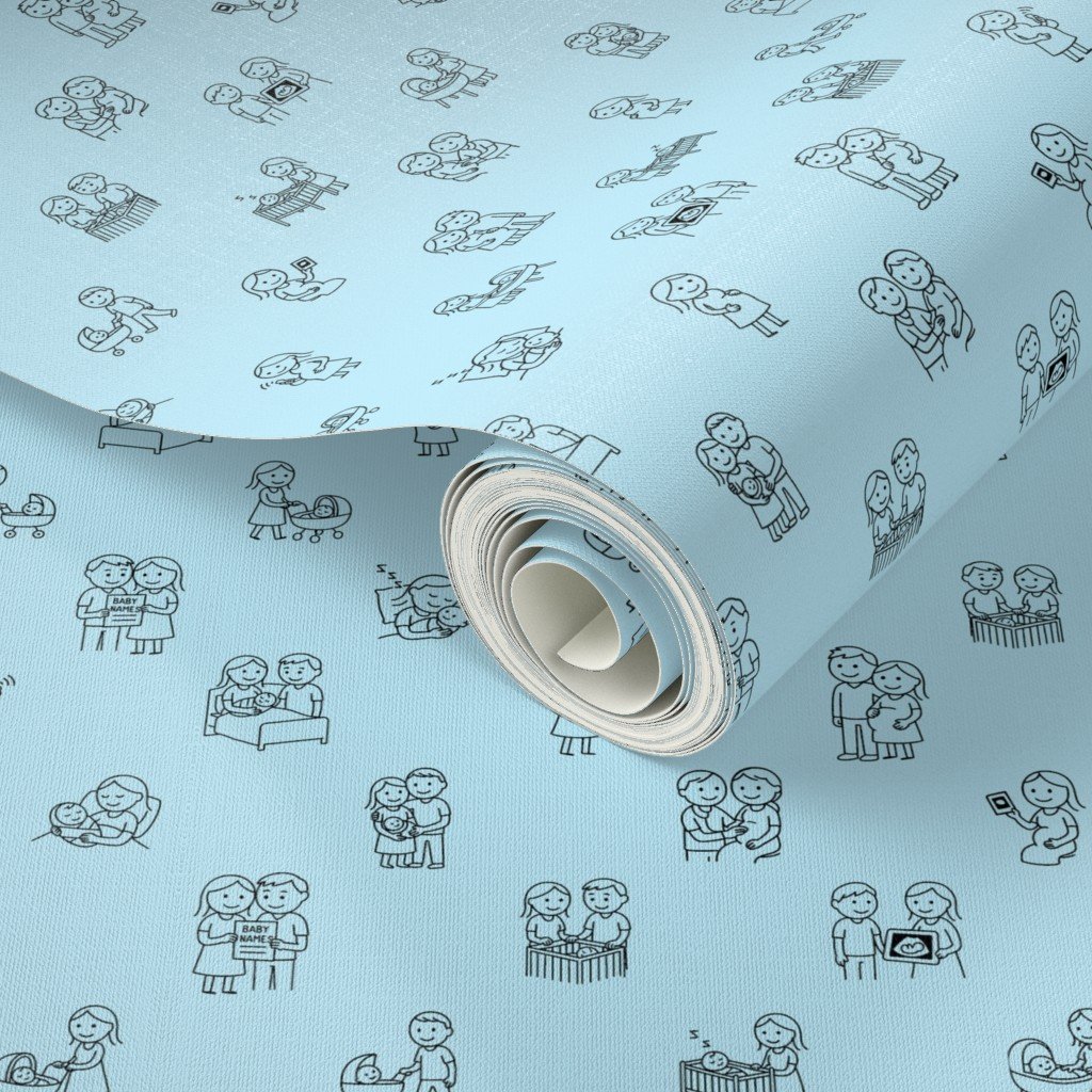 Bold black stick figure baby scenes on a baby blue background—ideal for modern nursery prints and baby shower decor.