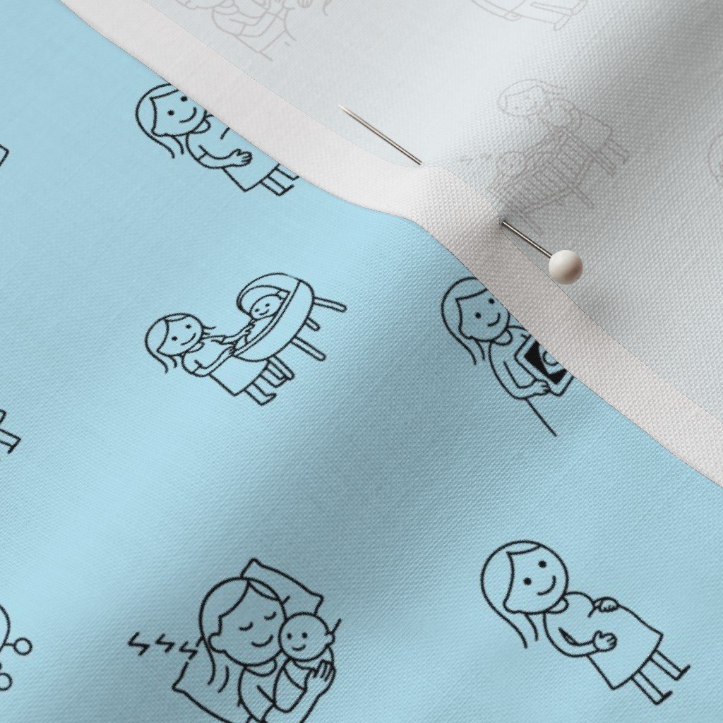 Bold black stick figure baby scenes on a baby blue background—ideal for modern nursery prints and baby shower decor.
