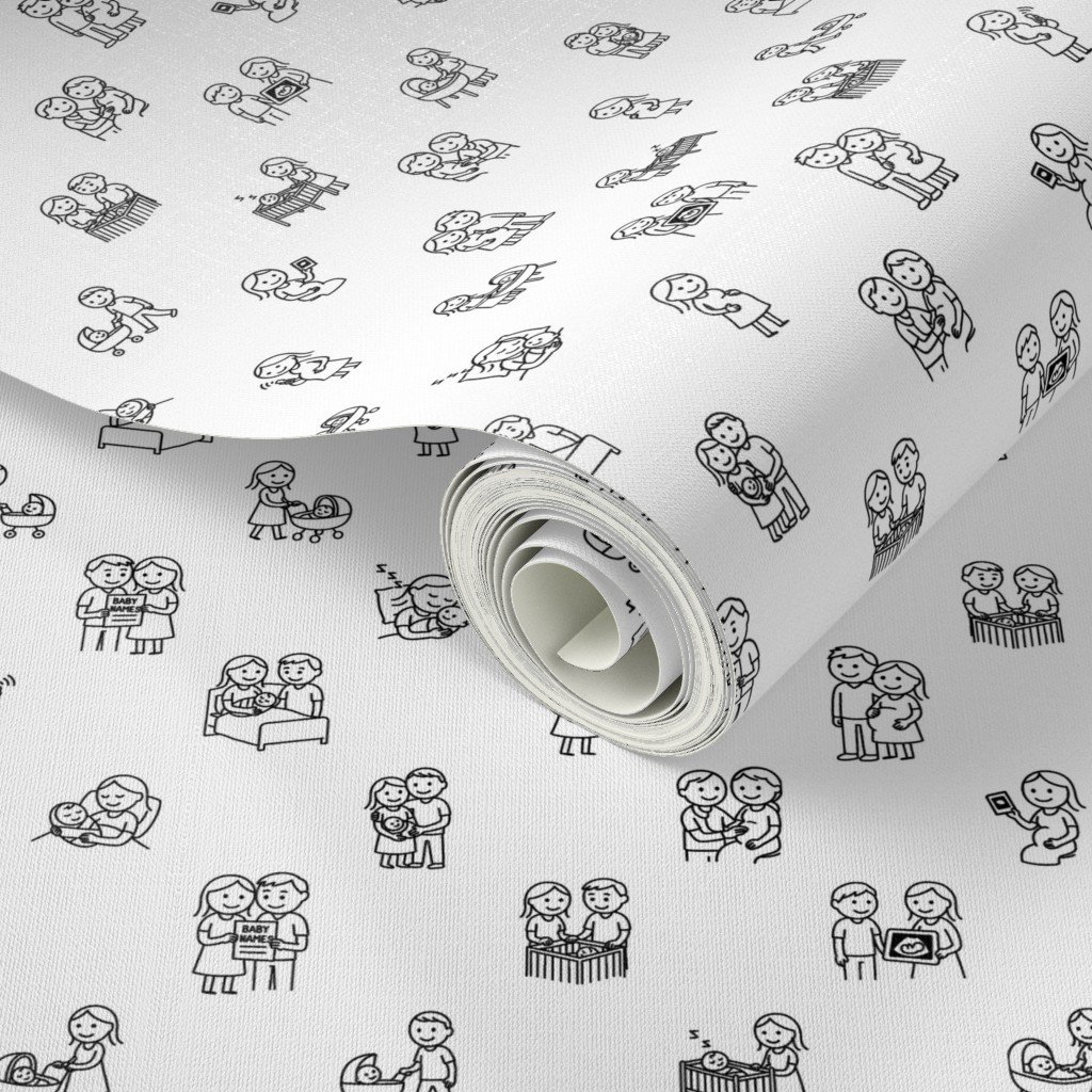 A playful black on white pattern featuring stick figure moments from pregnancy to baby cuddles, perfect for baby shower and nursery decor.