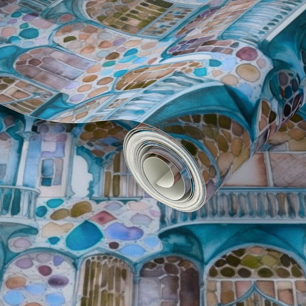 Architectural details of famed Art Deco house in Barcelona with pelmets, double windows, architraves and columns in watercolors in blues