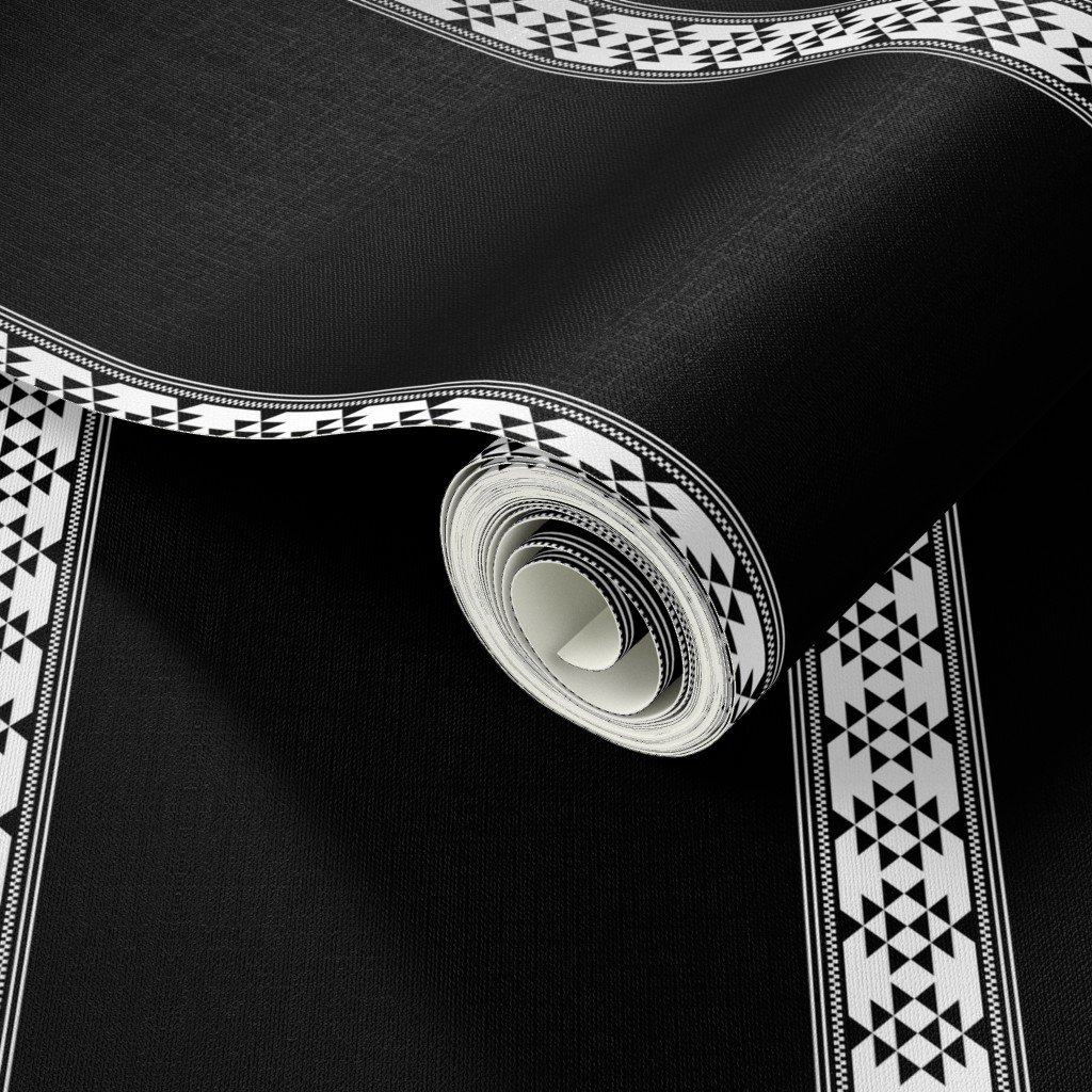 6 inch wide black bands with accent of white and black tribal motifs in geometric triangles separating each band