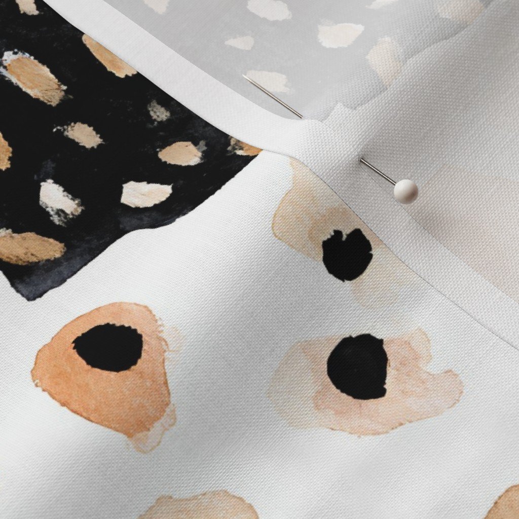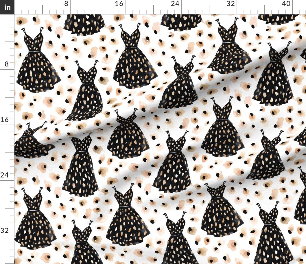 A bold fashion repeat featuring black dresses paired with soft abstract spot accents on a clean white background. Designed at a larger scale for statement apparel, accessories, and modern fashion-forward projects.