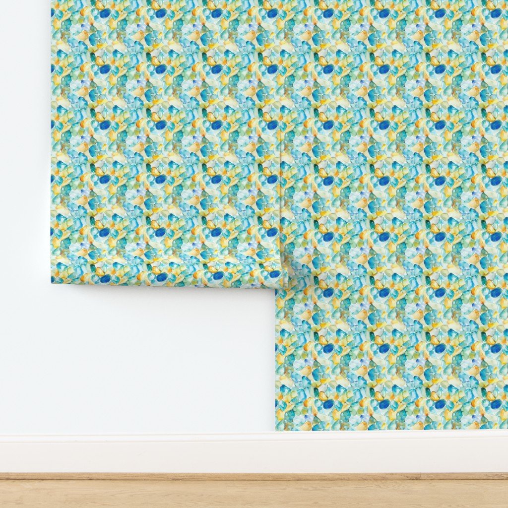 Tumbled by the waves, these blue and amber broken shards of seaglass are scattered in a random watercolor repeat