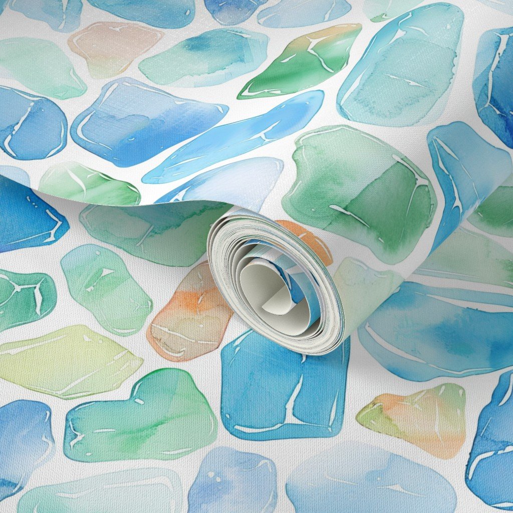 Tumbled by the waves, these blue and green broken shards of seaglass are scattered in a random watercolor repeat