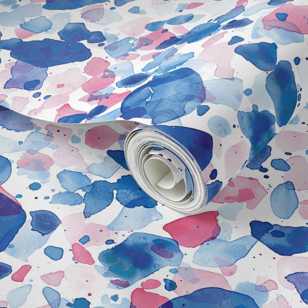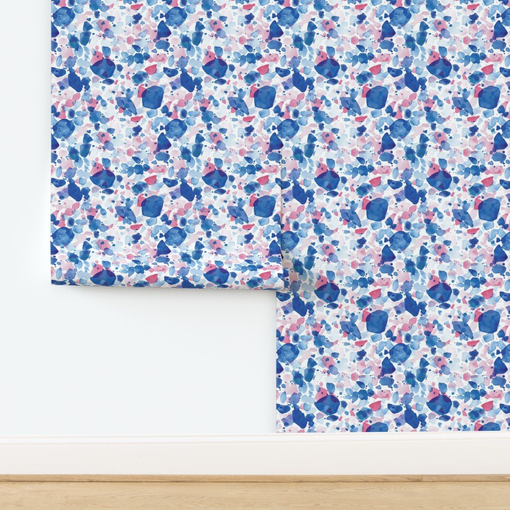 Watercolor splashes in blue and rose of broken and scattered terrazzo tile in a random repeat pattern
