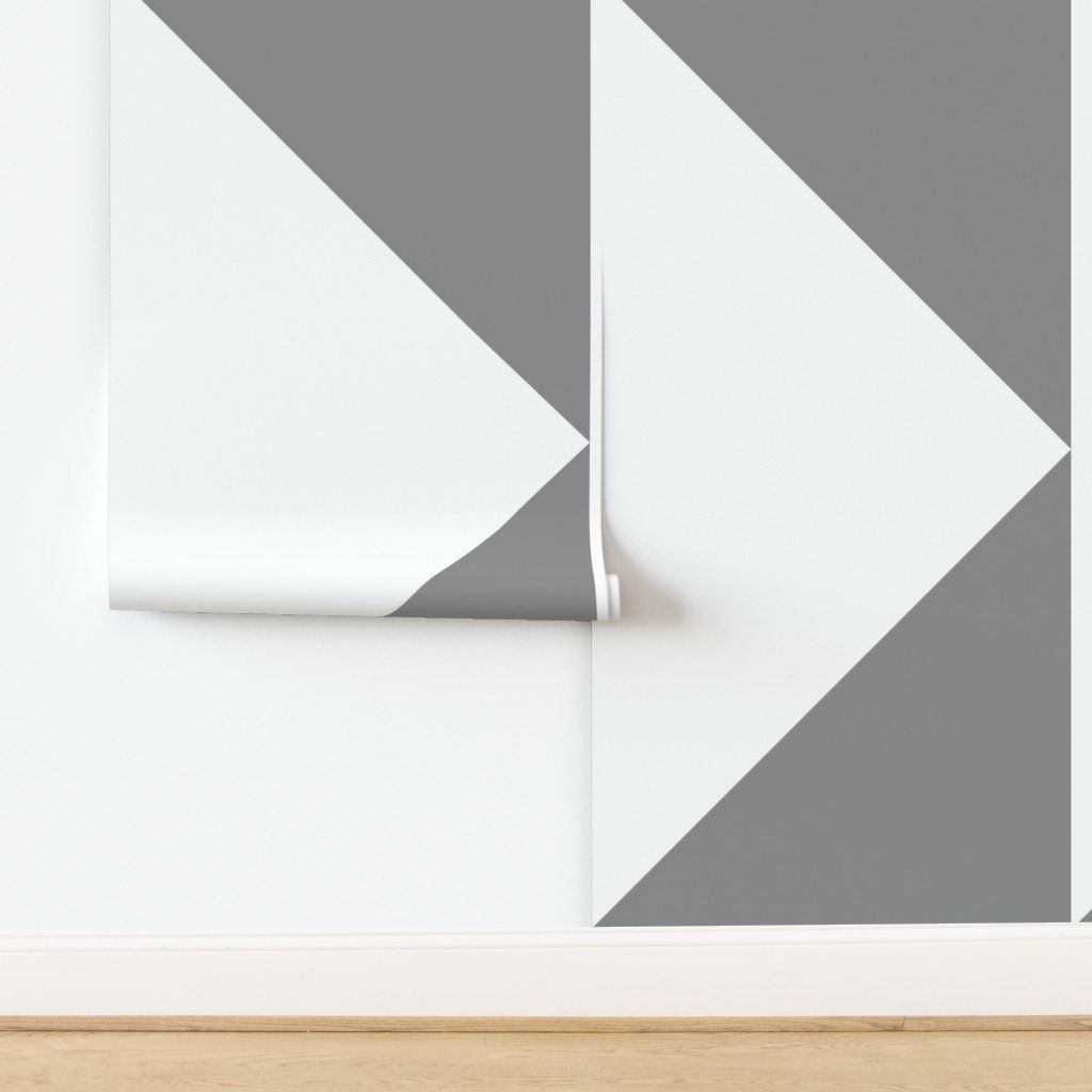 A bold large-scale geometric wallpaper featuring oversized mid gray triangles on white, arranged in a clean architectural pattern. Designed for open interiors, staircases, dining rooms, and statement feature walls, this design delivers modern structure