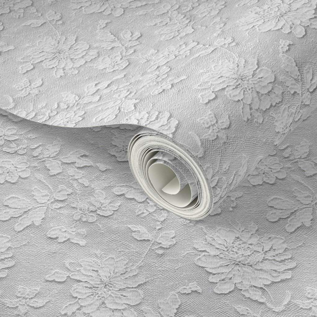 This Chantilly lace floral pattern features delicate rose and blossom motifs woven through fine netted lace texture in soft white. Inspired by traditional bridal lace, this elegant watercolor-style design is ideal for wedding fabric, veils, dresses, table