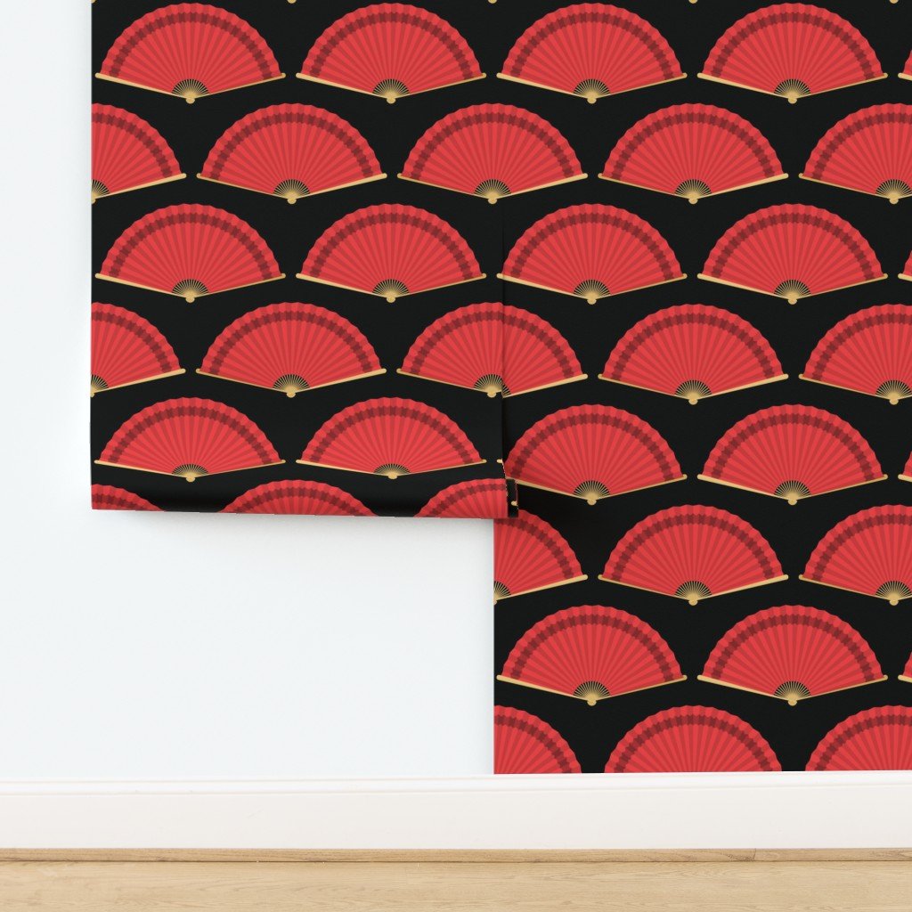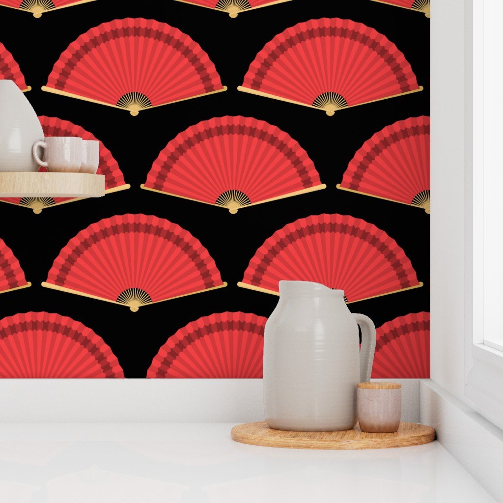 Elegant Chinese red folding fans arranged in bold repeat over a deep black background for a dramatic and cultural wall statement.