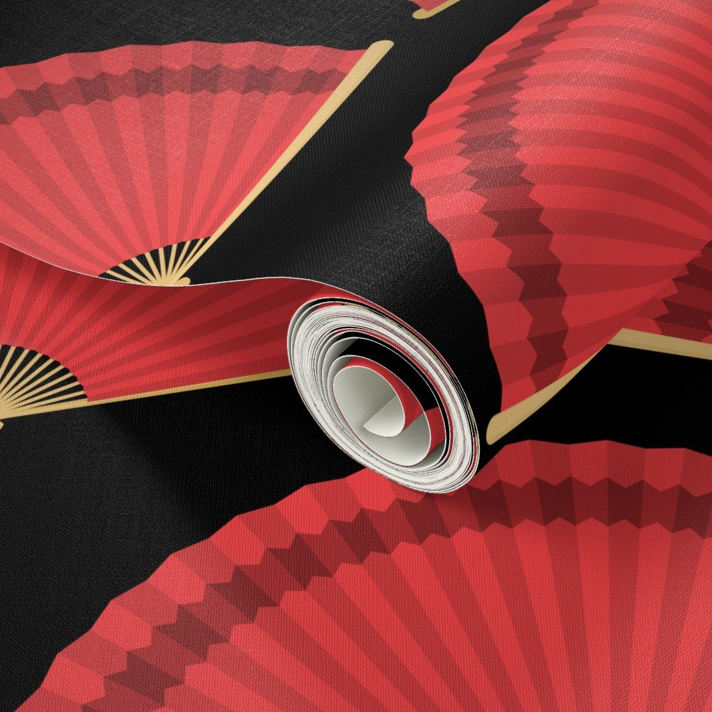 Chinese Red Folding Fans Pattern on Black Background Wallpaper