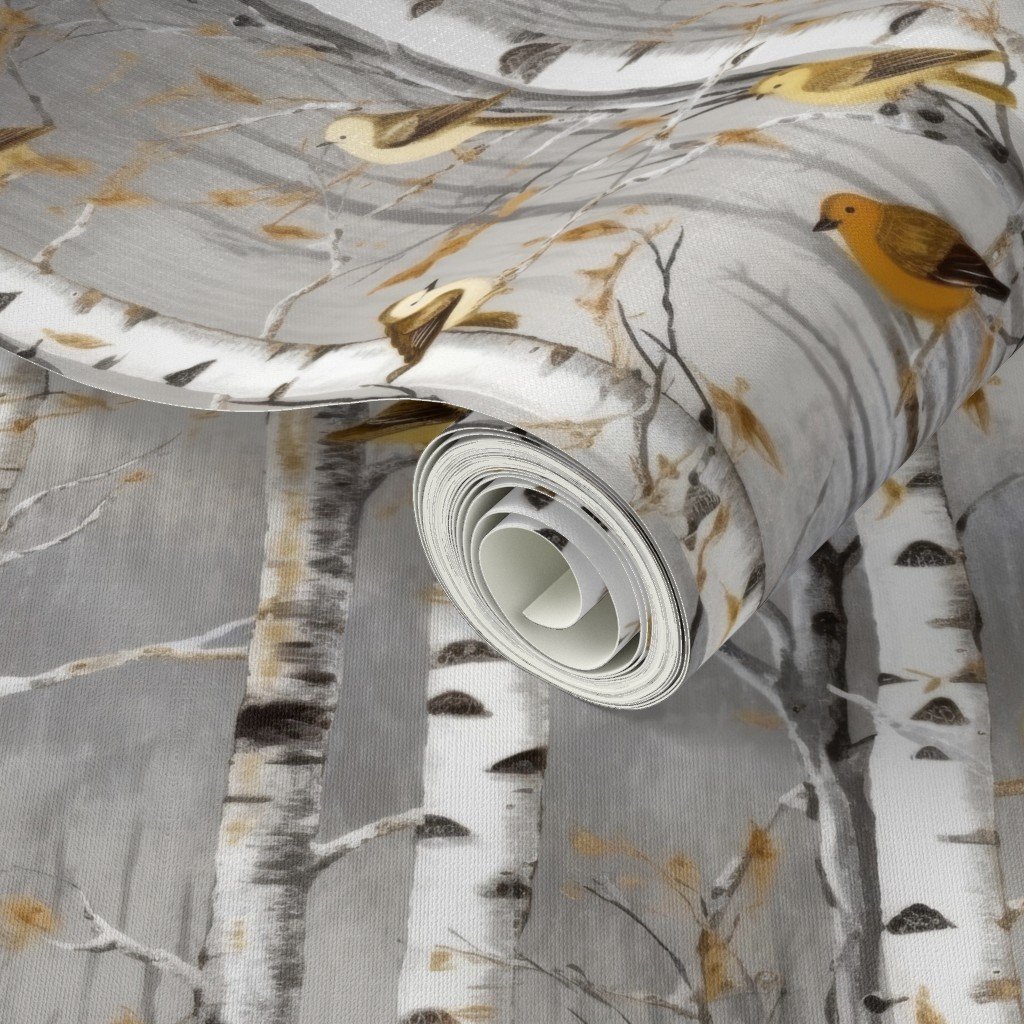 This serene pattern features birch trees in a wintery landscape, adorned with yellow and orange birds perched on the branches.
