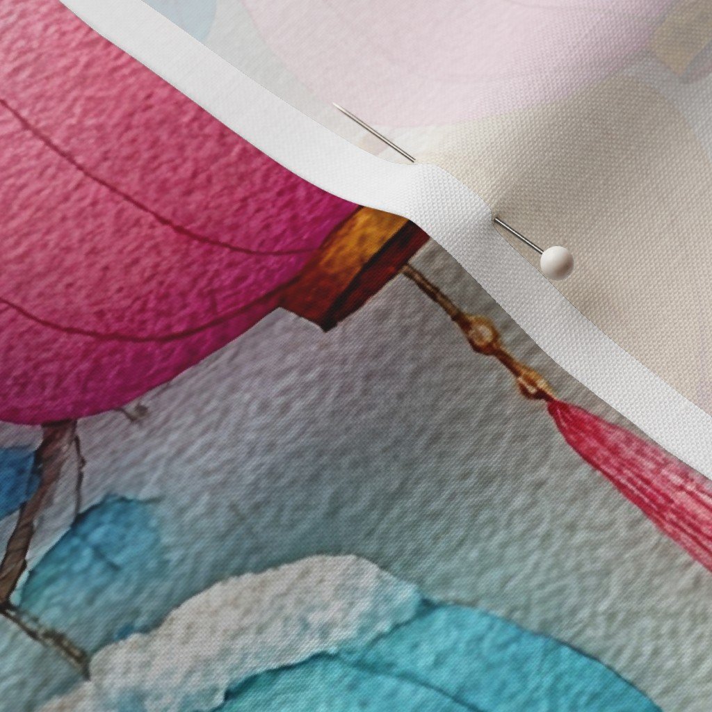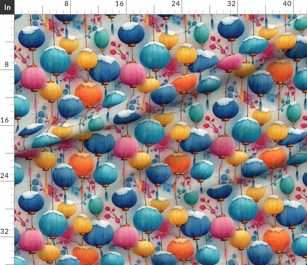 This watercolor design features colorful Christmas lanterns dusted with snow, glowing in shades of blue, gold, pink, and orange. A festive winter pattern perfect for holiday décor, wrapping, and cheerful seasonal crafts.