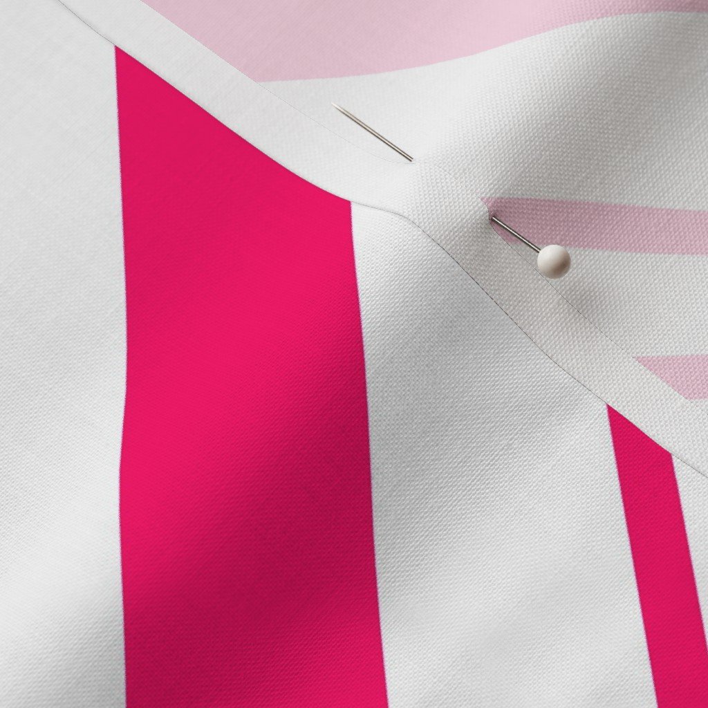 lively design featuring bold bright pink diagonal stripes on a clean white background. SpecificationsFabric content: 100% CottonPrinted width: 42 inchesWeight: 4.4 oz/yd²Opacity: OpaqueConstruction: Plain WeaveShrinkage: 5-6% length x 2-3% widthThread count: 120Performance RatingsWyzenbeek (cotton duck abradant): 30,000 double rubs (ASTM D1457-13)Martindale: 20,000 cycles (ASTM 4966-22)Crocking dry (1 severe – 5 no color transfer): Exceeds 3 (AATCC TM 8)Crocking wet (1 severe – 5 no color transfer): Exceeds 3.5 (AATCC TM 8)Pilling (1 severe – 5 none): 4.5Note or Country of OriginCountry: Woven in IndonesiaPrinting: Digitally printed in the USA with water-based inksFabric backing: The backside of the fabric will be unprinted