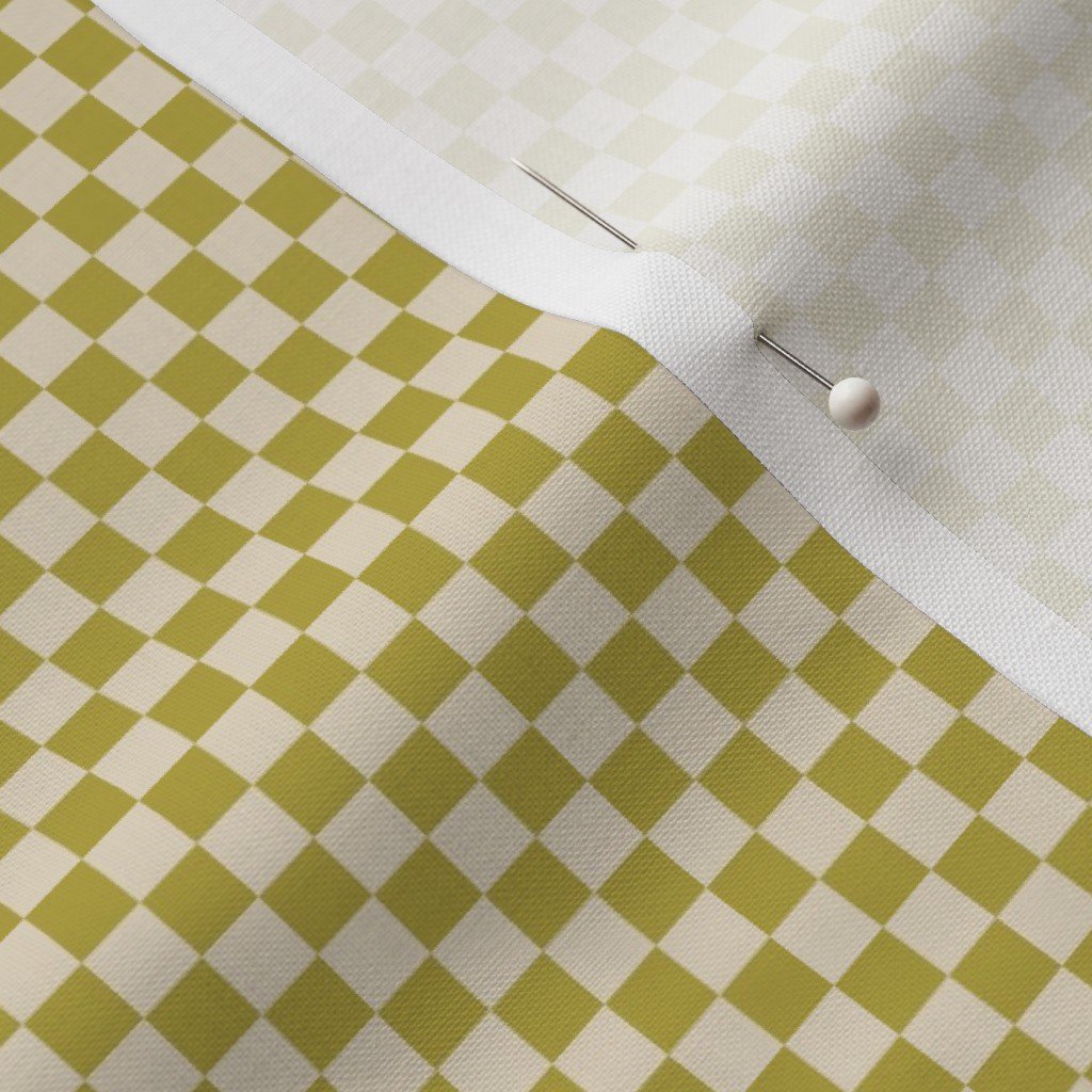 A 1/4 inch Classic check in Mustard Regret on Soft Linen Cream. This fine check adds gentle texture while pairing a rich mustard tone with a calm neutral ground.