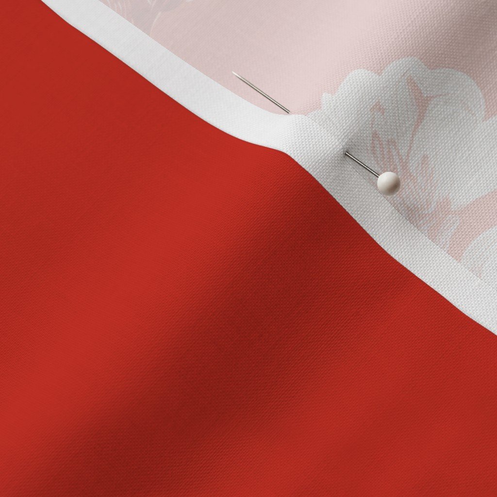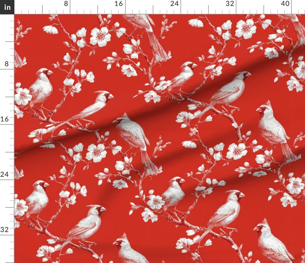 Delicate cardinal songbirds perch among blossoming orchard branches in this timeless red and white toile design. Fine engraved linework and detailed botanicals create striking contrast, blending heritage charm with bold, classic elegance.