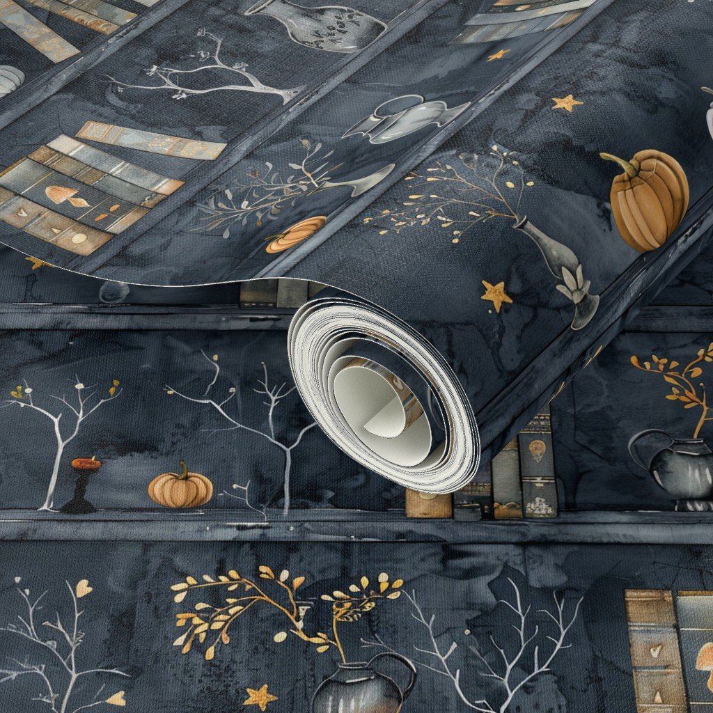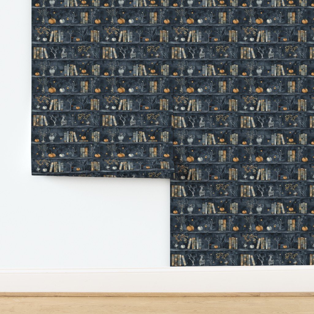 Be the first to review “Dark Blue Halloween Pumpkins and Vases on Vintage Bookcase Wallpaper”