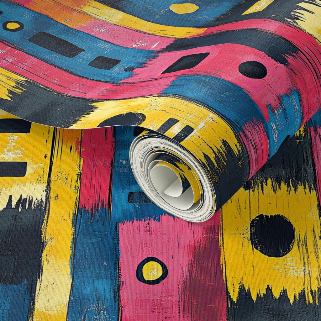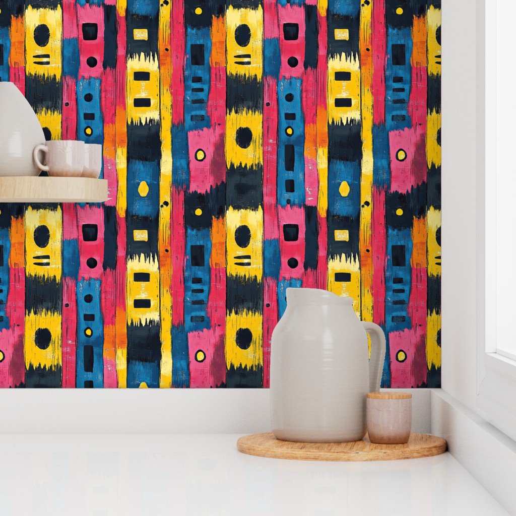 Bold brushstrokes in yellow, blue, and pink with geometric shapes create a vibrant, Afrocentric pattern perfect for fabric or fashion designs.