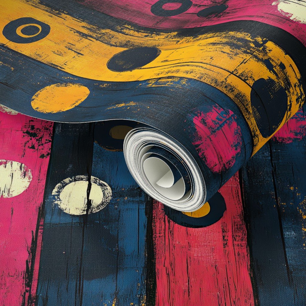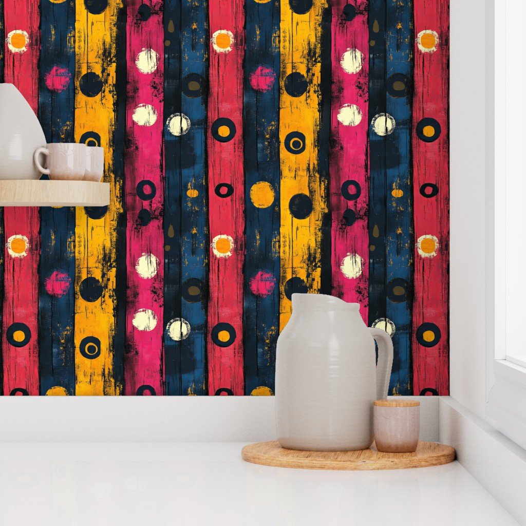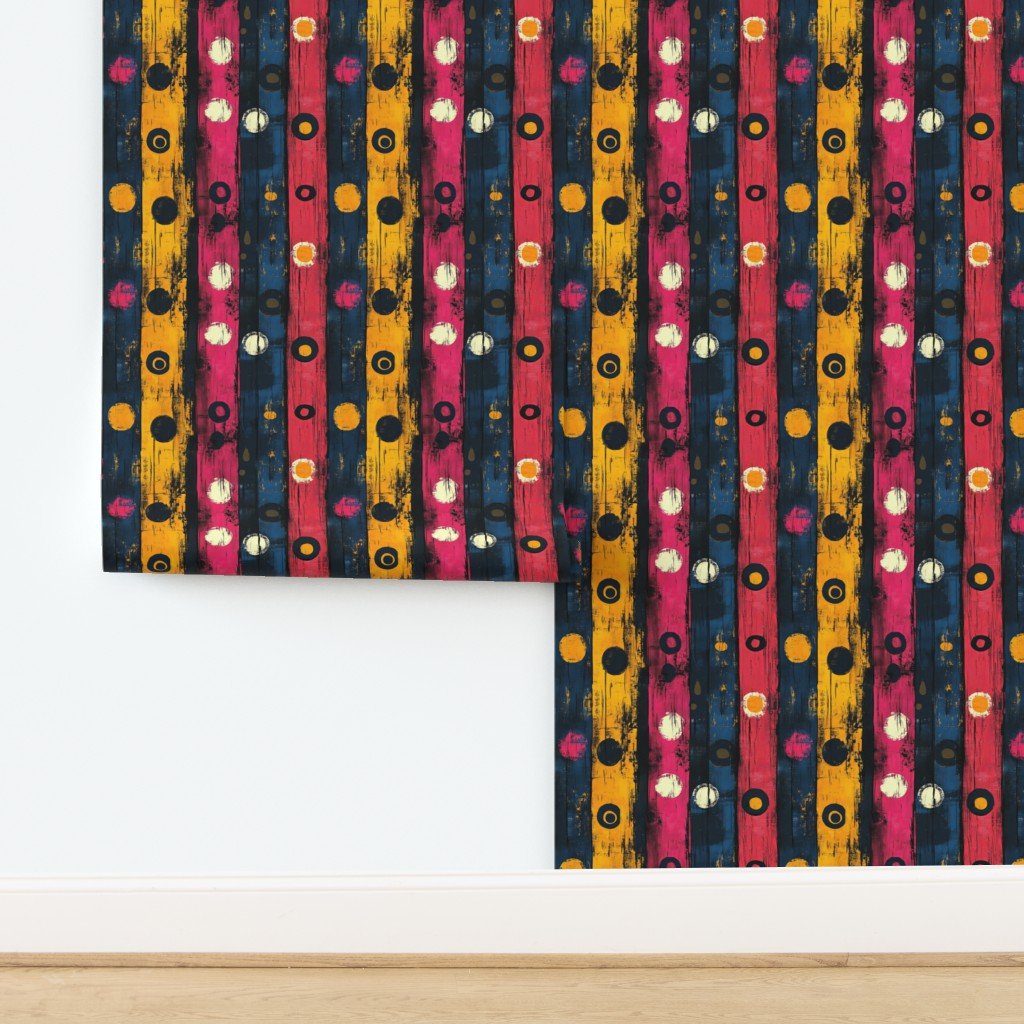 Bold circles in yellow, pink, and blue with a textured black background create a vibrant, Afrocentric pattern ideal for fabric, fashion, or decor.