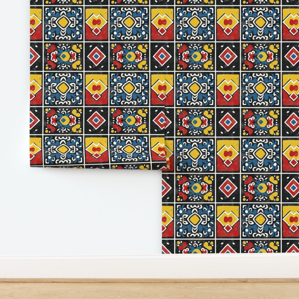 Dashiki Fusion Bold Geometric Yellow Red and Blue on Black Wallpaper