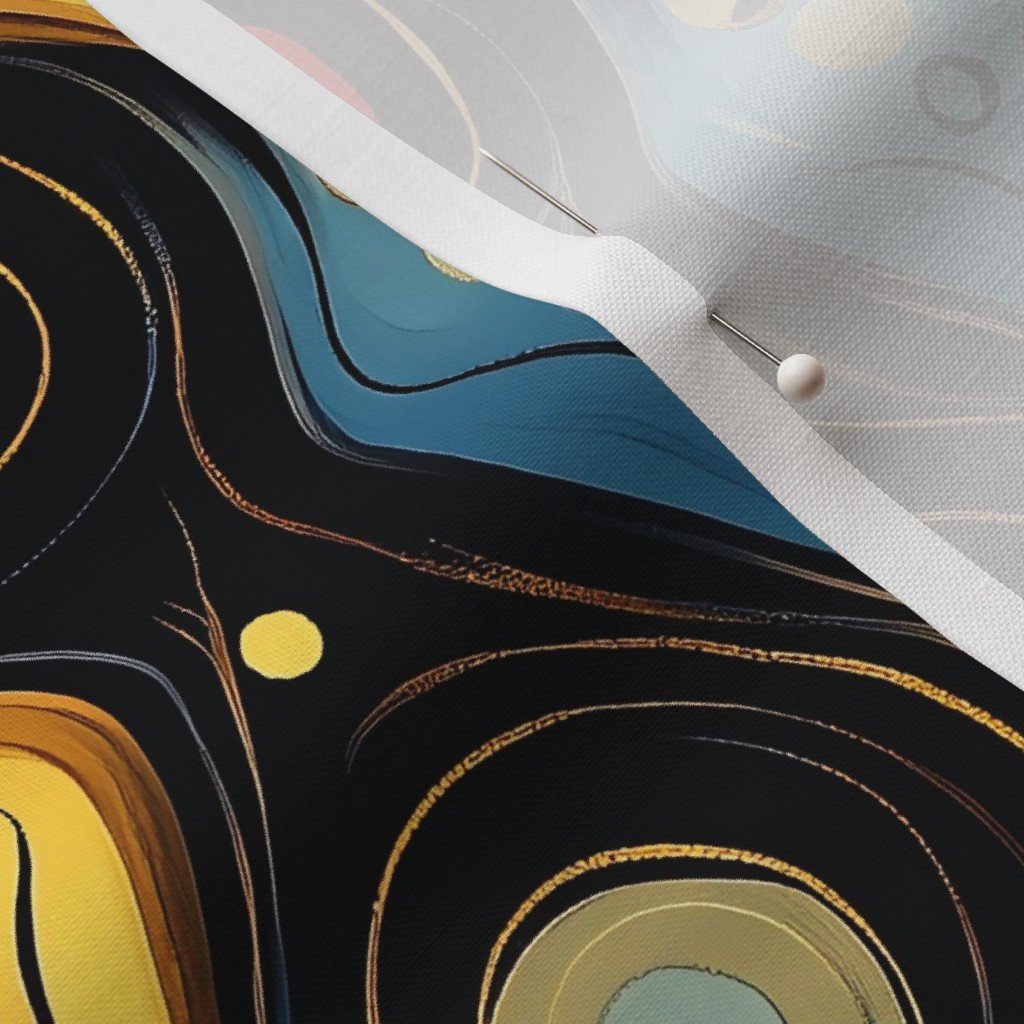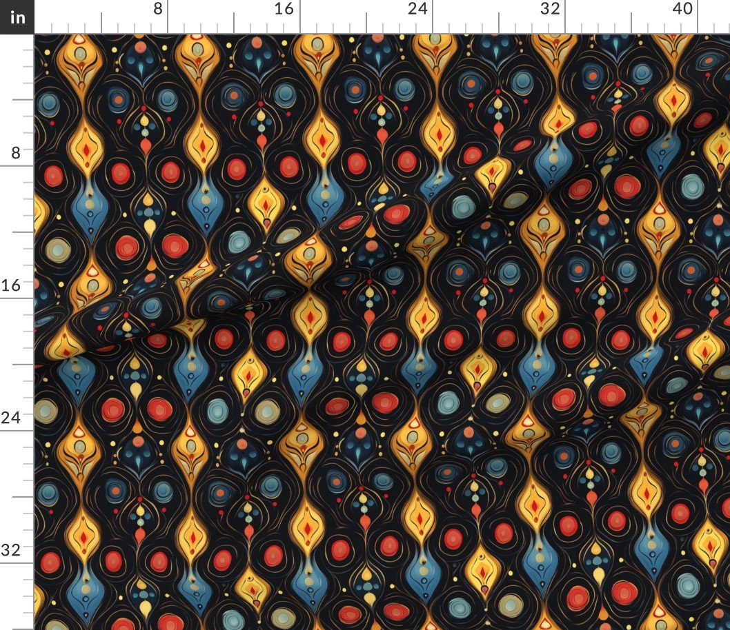 Bold teardrops and circles in yellow, blue, and red over a black background create a vibrant Dashiki Fusion pattern, perfect for fabric or decor.SpecificationsFabric content: 100% CottonPrinted width: 42 inchesWeight: 4.4 oz/yd²Opacity: OpaqueConstruction: Plain WeaveShrinkage: 5-6% length x 2-3% widthThread count: 120Performance RatingsWyzenbeek (cotton duck abradant): 30,000 double rubs (ASTM D1457-13)Martindale: 20,000 cycles (ASTM 4966-22)Crocking dry (1 severe – 5 no color transfer): Exceeds 3 (AATCC TM 8)Crocking wet (1 severe – 5 no color transfer): Exceeds 3.5 (AATCC TM 8)Pilling (1 severe – 5 none): 4.5Note or Country of OriginCountry: Woven in IndonesiaPrinting: Digitally printed in the USA with water-based inksFabric backing: The backside of the fabric will be unprinted