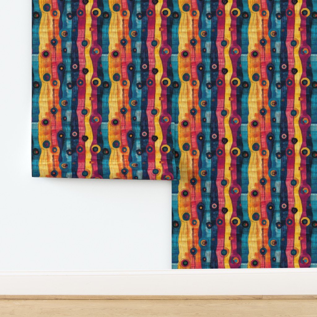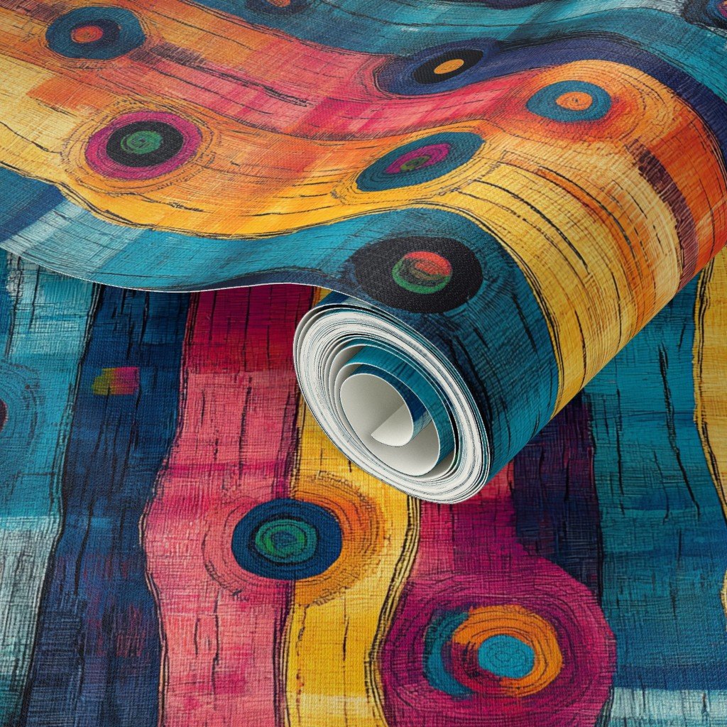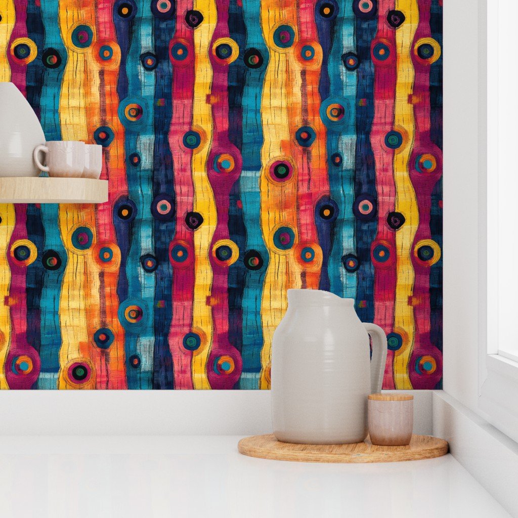 Vibrant circles in yellow, blue, and pink with flowing wave-like lines create a bold Dashiki Fusion pattern, perfect for fabric, fashion, or decor.