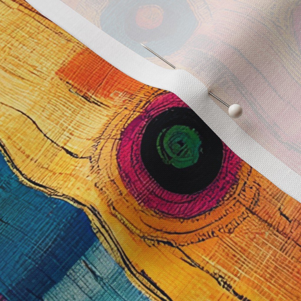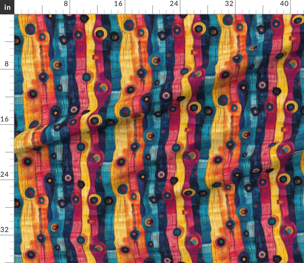 Vibrant circles in yellow, blue, and pink with flowing wave-like lines create a bold Dashiki Fusion pattern, perfect for fabric, fashion, or decor.SpecificationsFabric content: 100% CottonPrinted width: 42 inchesWeight: 4.4 oz/yd²Opacity: OpaqueConstruction: Plain WeaveShrinkage: 5-6% length x 2-3% widthThread count: 120Performance RatingsWyzenbeek (cotton duck abradant): 30,000 double rubs (ASTM D1457-13)Martindale: 20,000 cycles (ASTM 4966-22)Crocking dry (1 severe – 5 no color transfer): Exceeds 3 (AATCC TM 8)Crocking wet (1 severe – 5 no color transfer): Exceeds 3.5 (AATCC TM 8)Pilling (1 severe – 5 none): 4.5Note or Country of OriginCountry: Woven in IndonesiaPrinting: Digitally printed in the USA with water-based inksFabric backing: The backside of the fabric will be unprinted