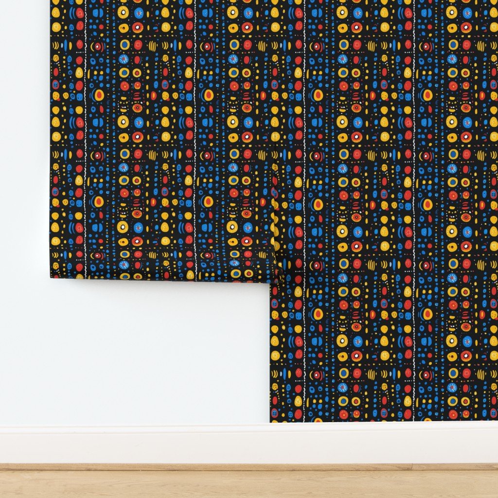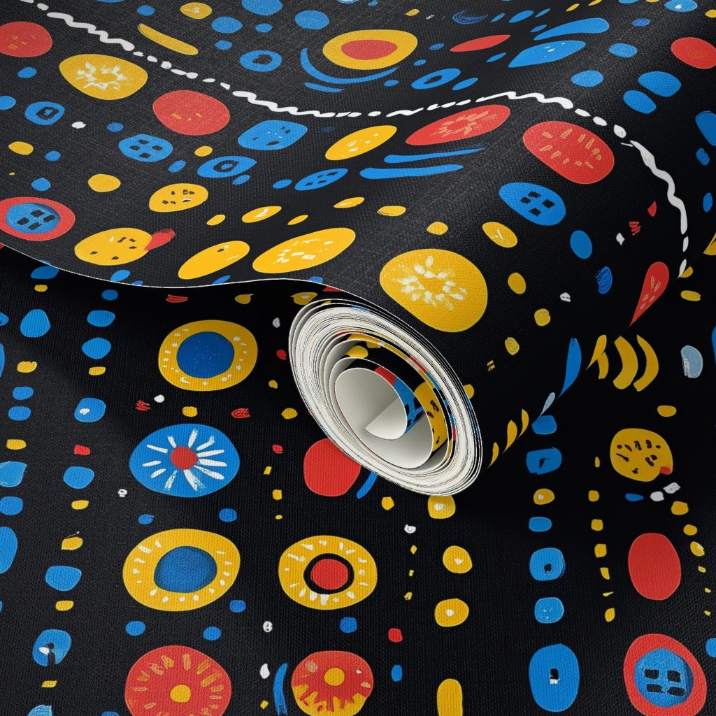 Colorful dots and circles in yellow, red, and blue create a vibrant Dashiki Fusion pattern, perfect for fabric, fashion, or home decor projects.