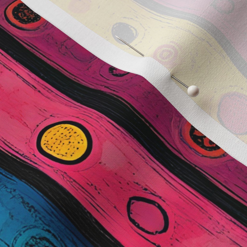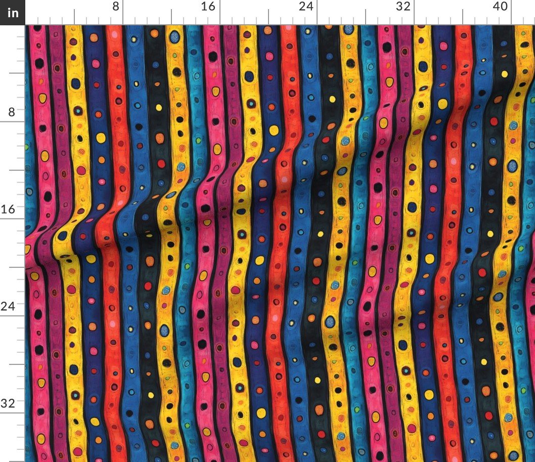 Colorful dots in yellow, red, and blue with bold stripes create a vibrant Dashiki Fusion pattern, perfect for fabric, fashion, or home decor projects.SpecificationsFabric content: 100% CottonPrinted width: 42 inchesWeight: 4.4 oz/yd²Opacity: OpaqueConstruction: Plain WeaveShrinkage: 5-6% length x 2-3% widthThread count: 120Performance RatingsWyzenbeek (cotton duck abradant): 30,000 double rubs (ASTM D1457-13)Martindale: 20,000 cycles (ASTM 4966-22)Crocking dry (1 severe – 5 no color transfer): Exceeds 3 (AATCC TM 8)Crocking wet (1 severe – 5 no color transfer): Exceeds 3.5 (AATCC TM 8)Pilling (1 severe – 5 none): 4.5Note or Country of OriginCountry: Woven in IndonesiaPrinting: Digitally printed in the USA with water-based inksFabric backing: The backside of the fabric will be unprinted