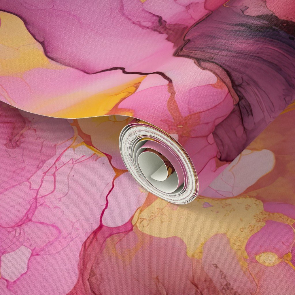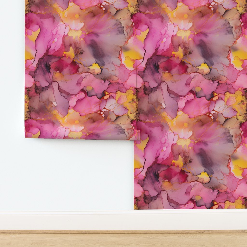 As the dawn rises, pinks , yellows and golden hues swirl in this liquid ink pattern