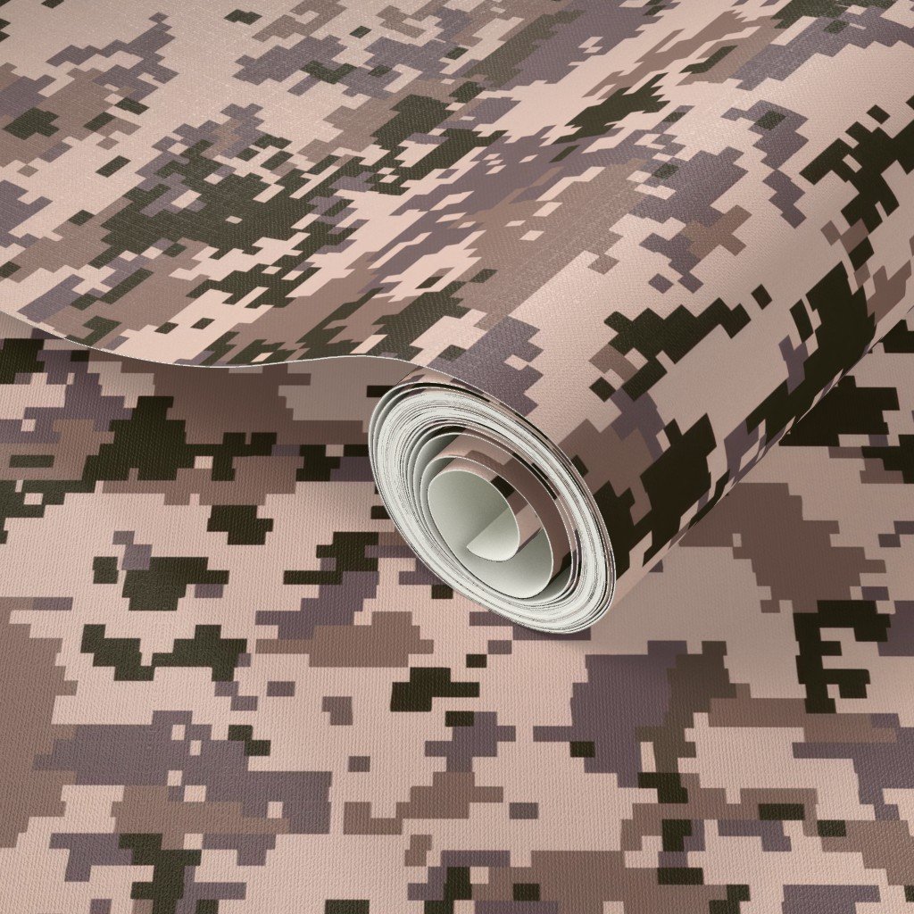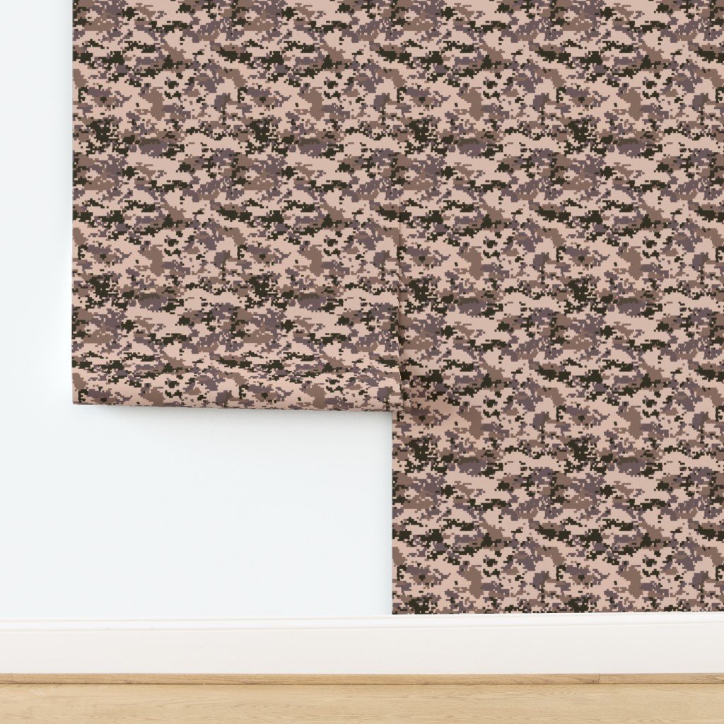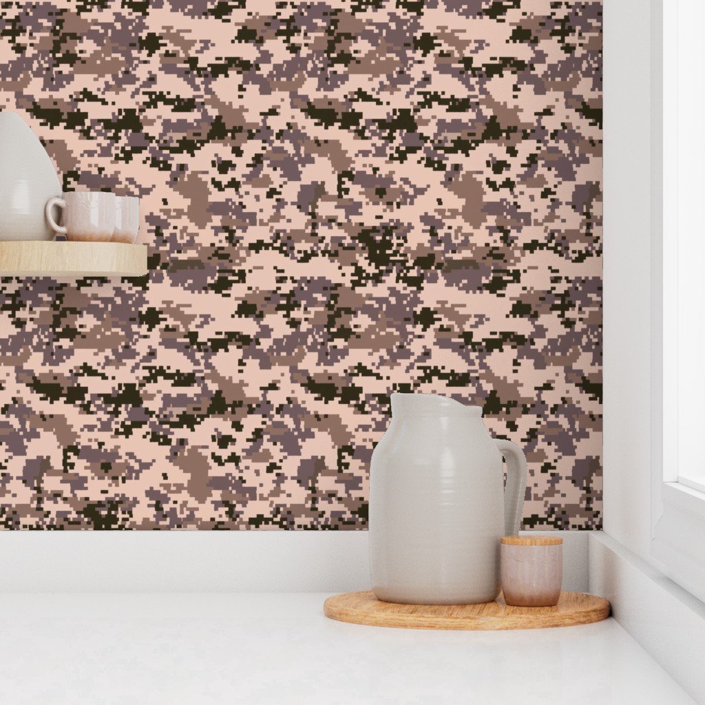 This digital camouflage design showcases pixelated swatches of desert sand, taupe, and brown, providing a perfect blend for arid and desert terrains.