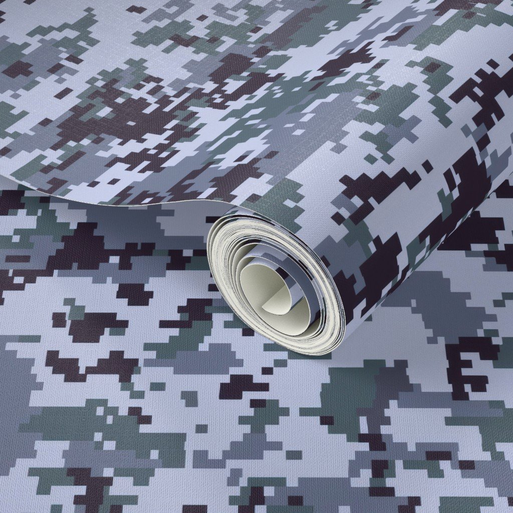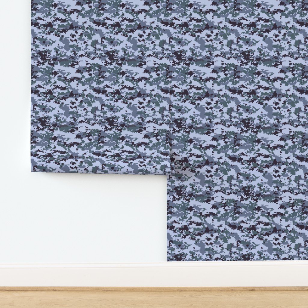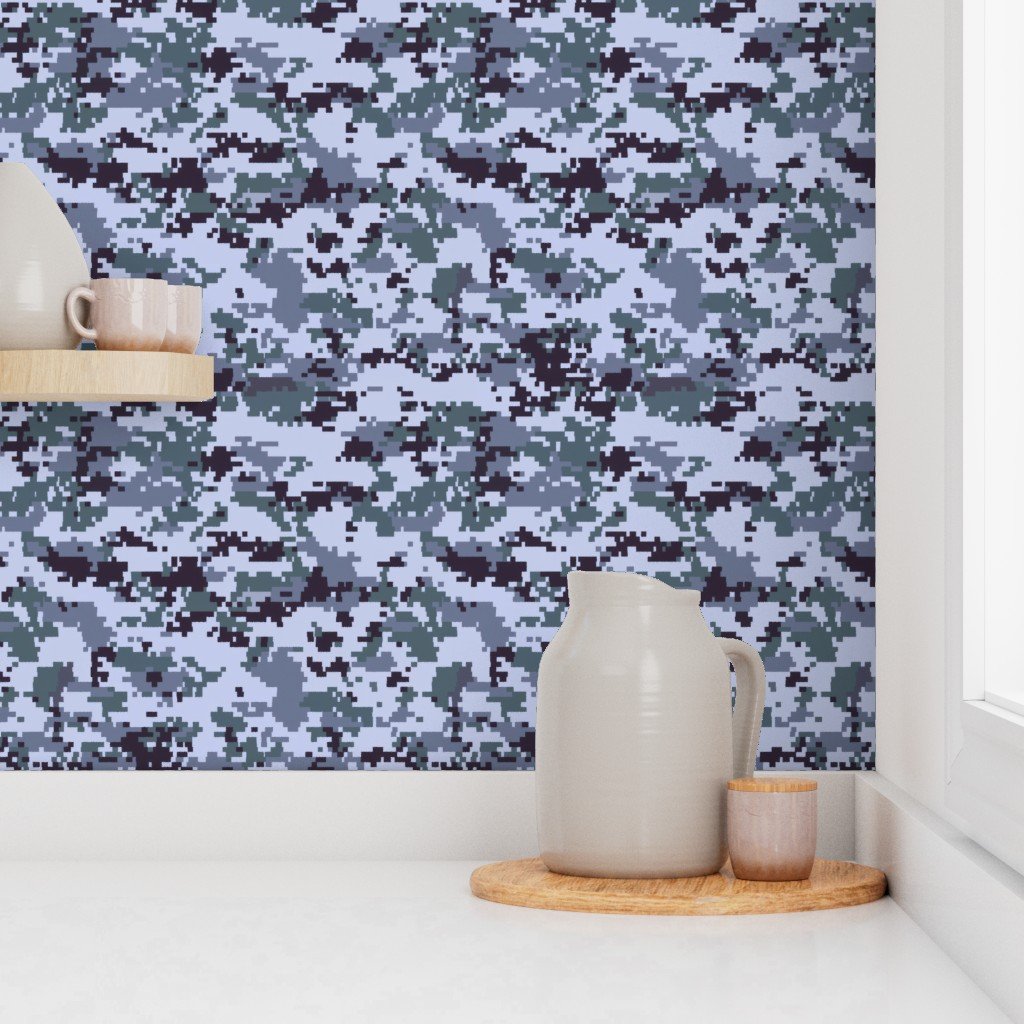 A digital camouflage pattern that uses pixelated swatches of slate grey, navy blue, and black to create a contemporary urban camo look.