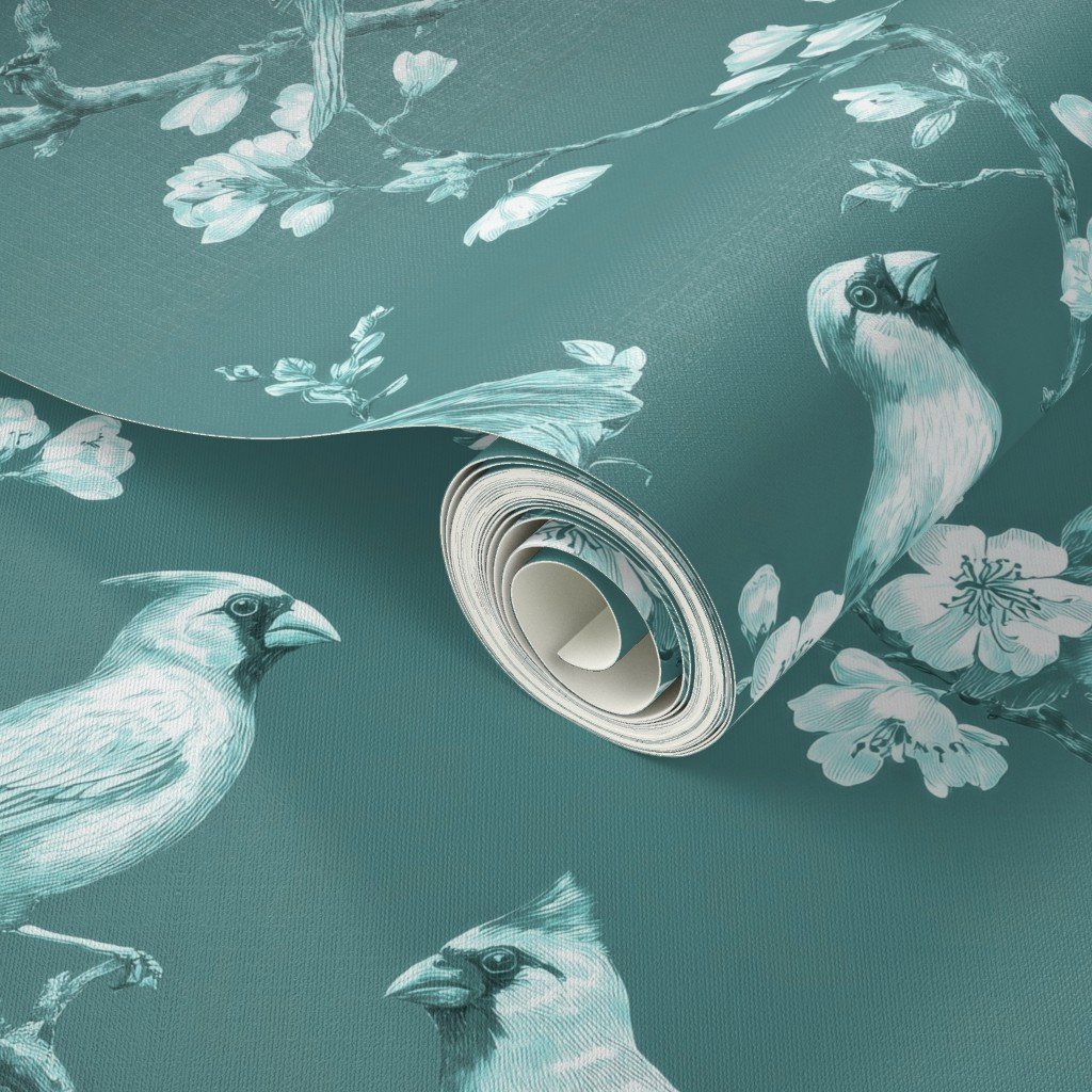 Delicate cardinal songbirds perch among blossoming orchard branches in this timeless toile design on a soft dusty teal background. Fine engraved linework and detailed botanicals create gentle contrast, blending traditional elegance with vintage charm.
