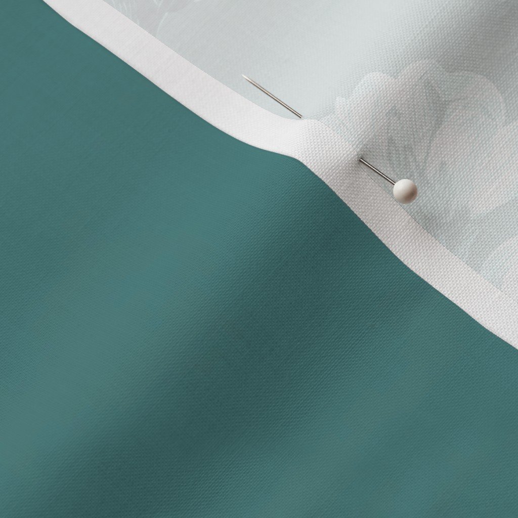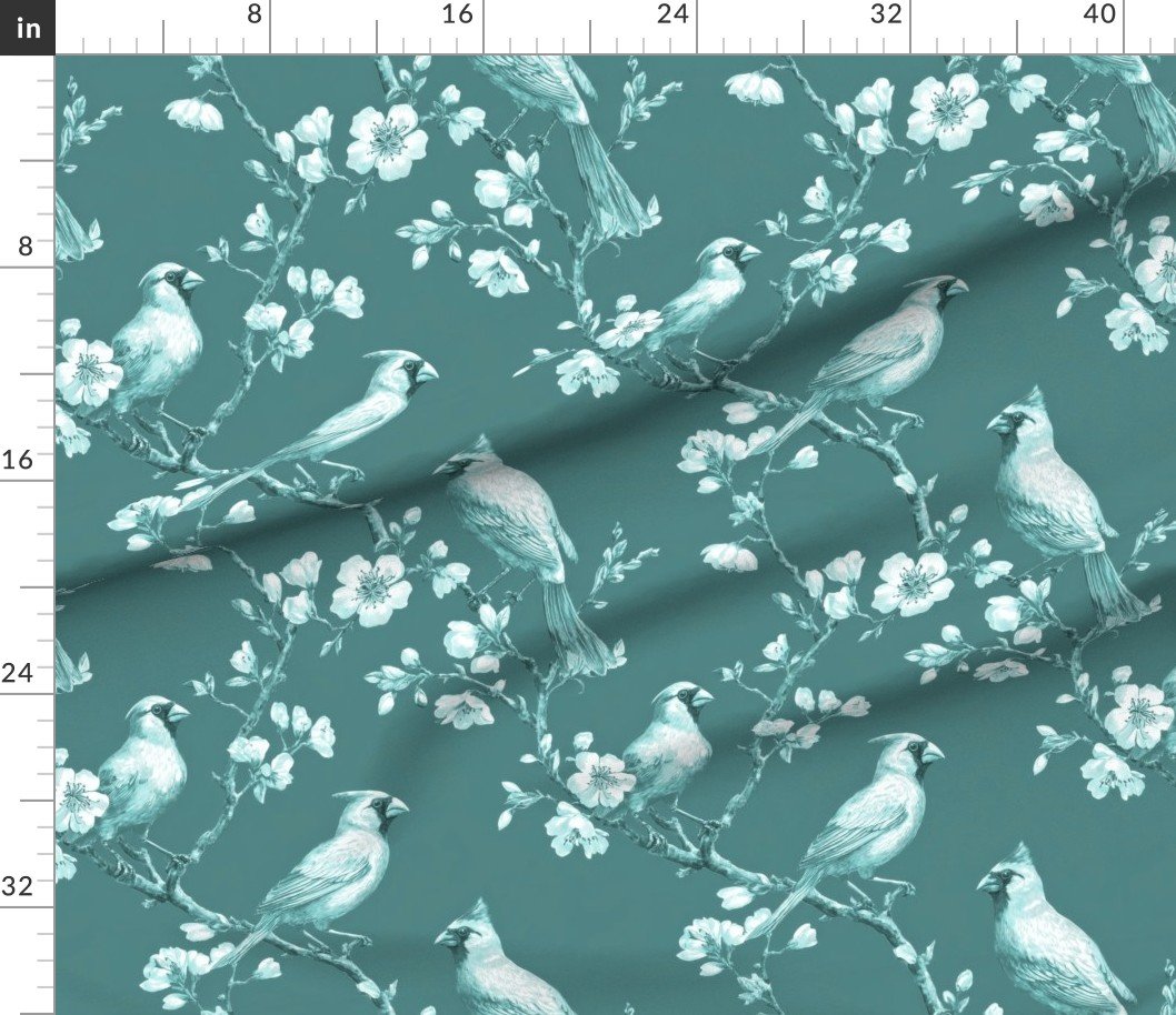 Delicate cardinal songbirds perch among blossoming orchard branches in this timeless toile design on a soft dusty teal background. Fine engraved linework and detailed botanicals create gentle contrast, blending traditional elegance with vintage charm.