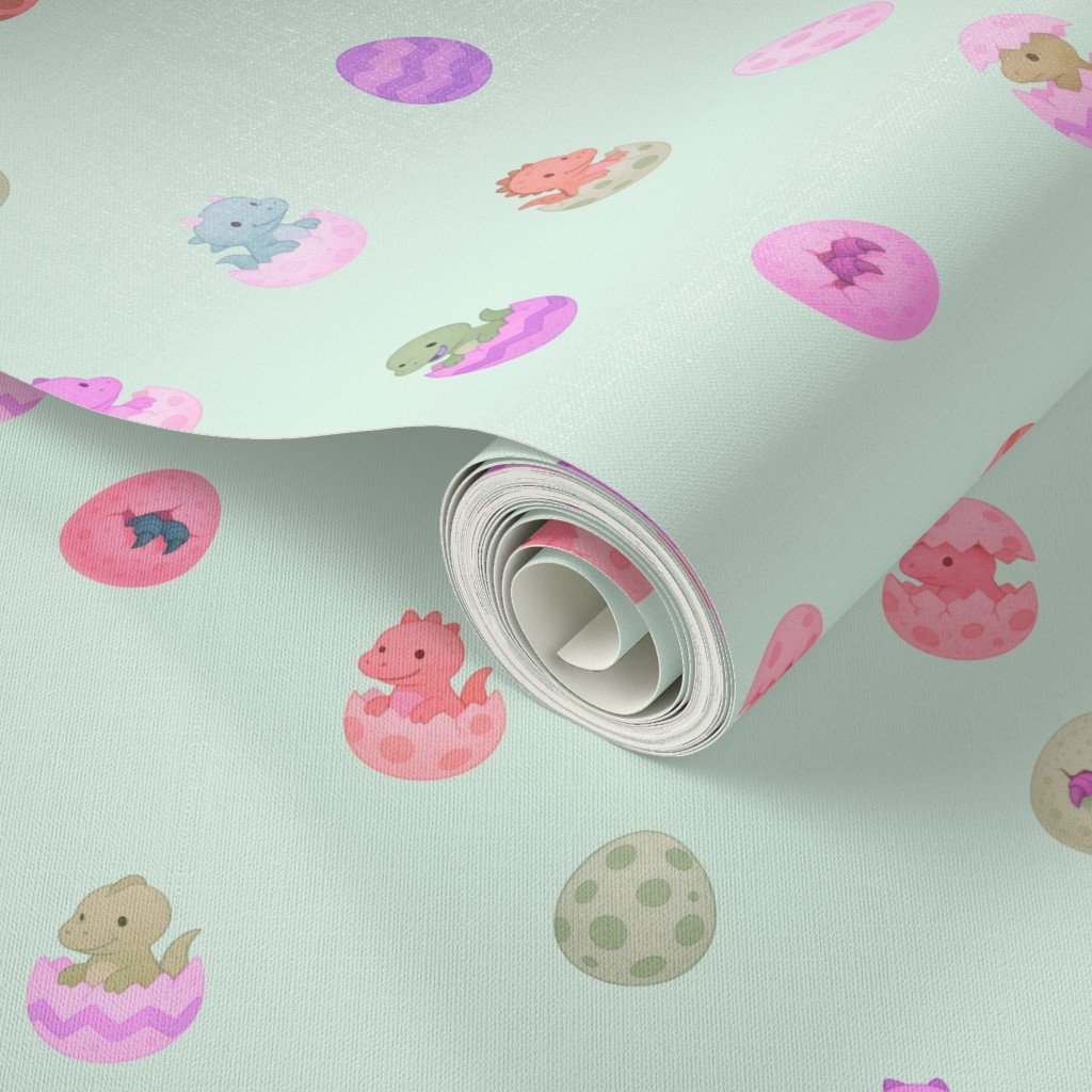 This Easter dinosaur pattern showcases adorable baby dinos hatching from pastel speckled eggs, painted in a gentle watercolor style on a soft mint green background. Sweet, playful, and calming, this design is ideal for nursery fabric, baby shower projects