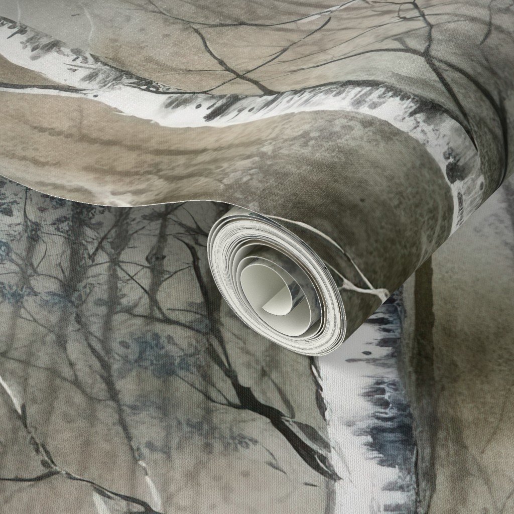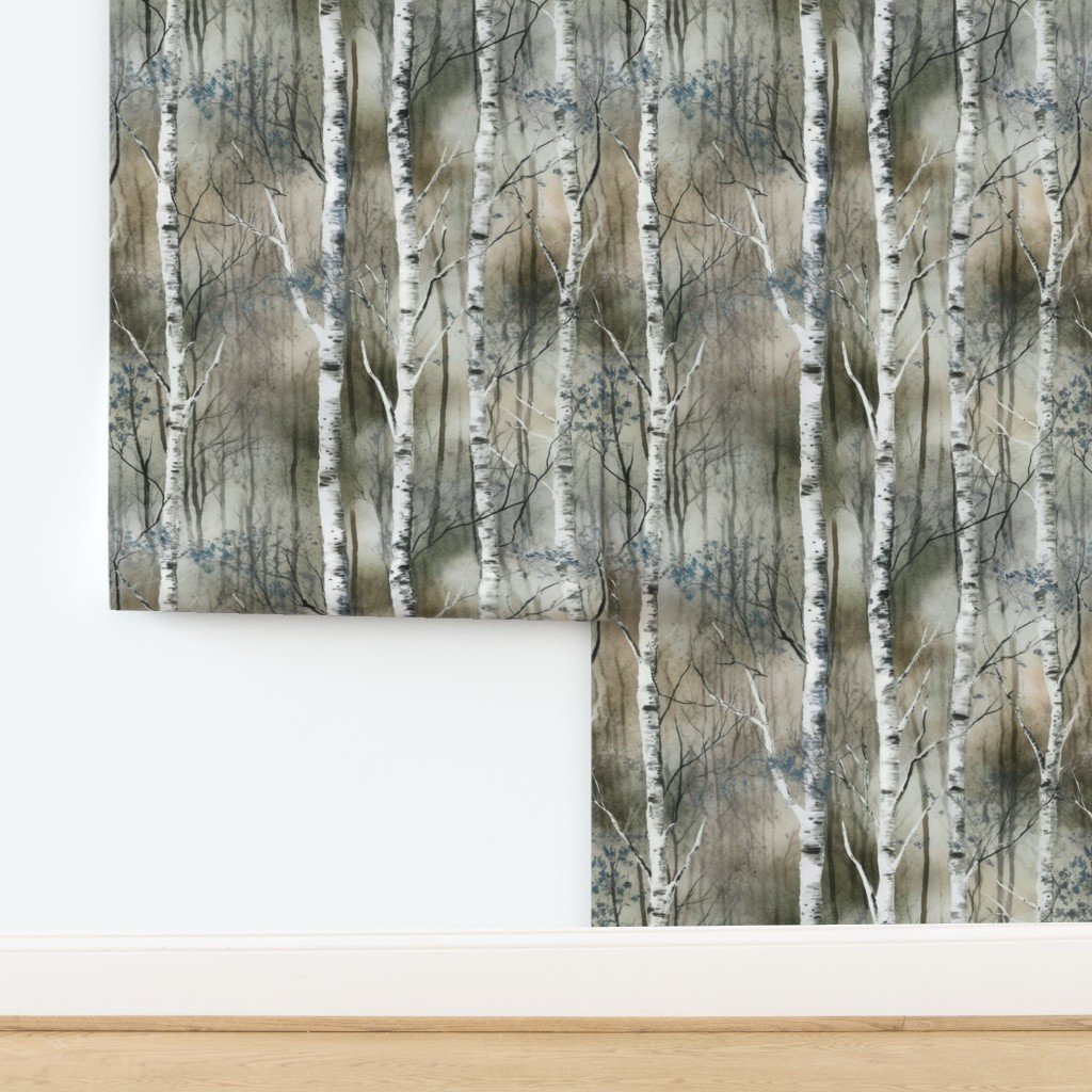 A dreamy landscape of silver birch trees in misty brown and blue tones. The watercolor effect enhances the serene forest atmosphere.