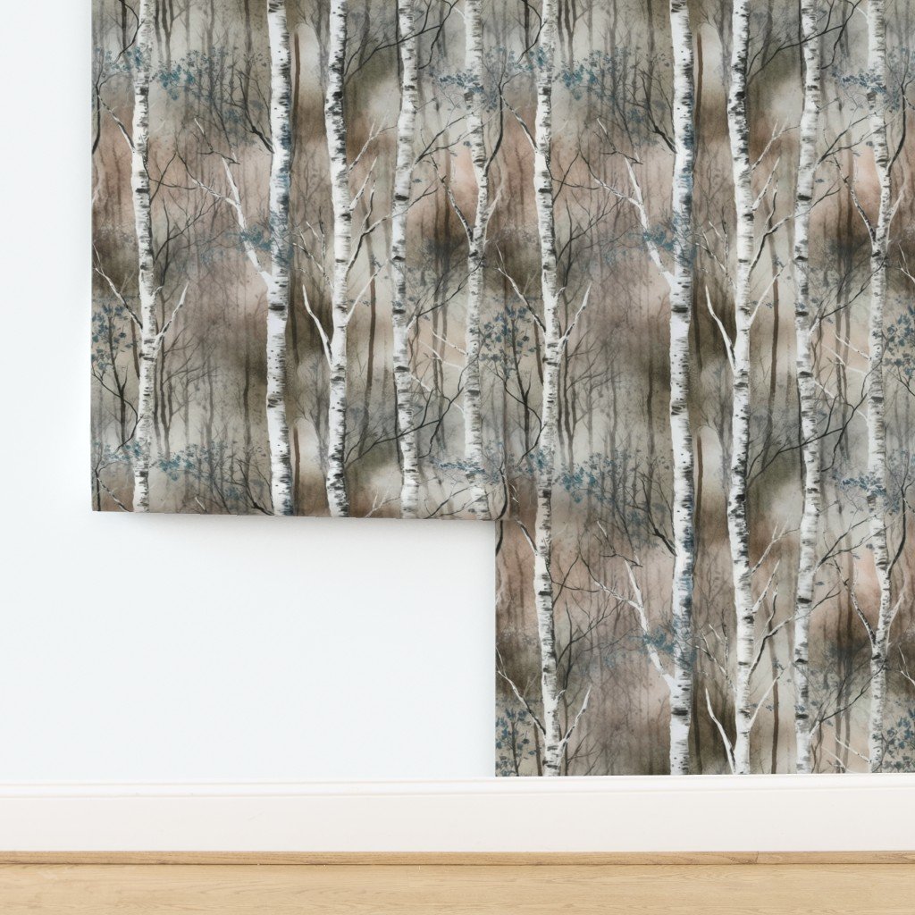 A serene watercolor pattern of silver birch trees in soft taupe and gray tones. This dreamscape evokes a calm, misty forest atmosphere, perfect for na