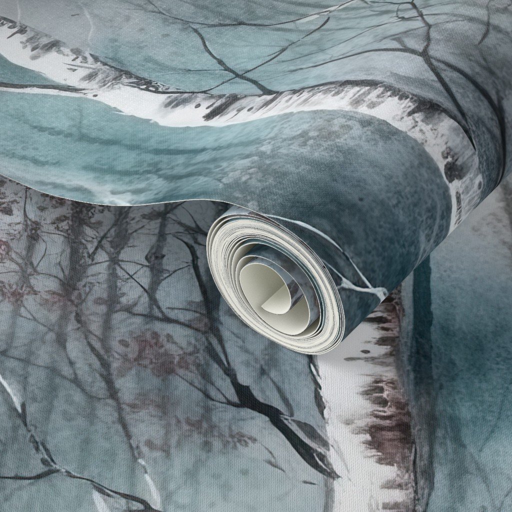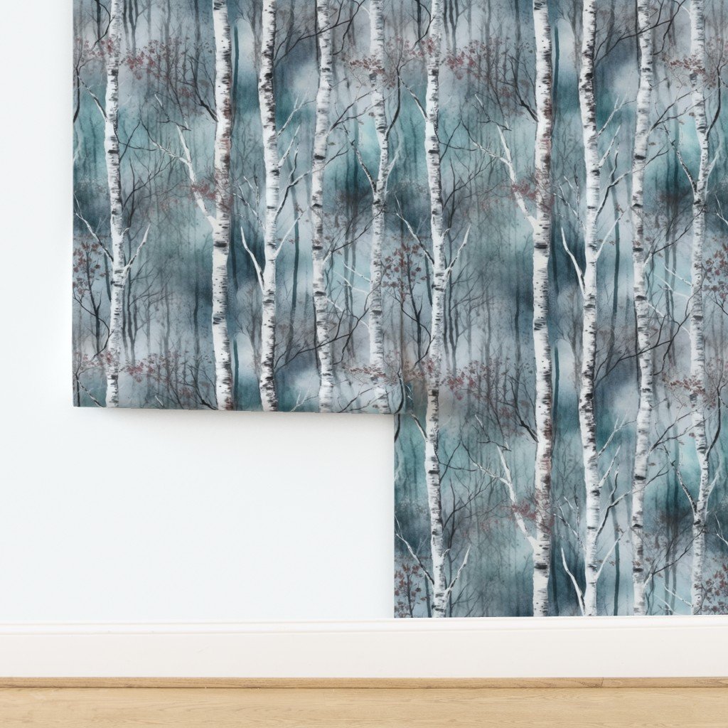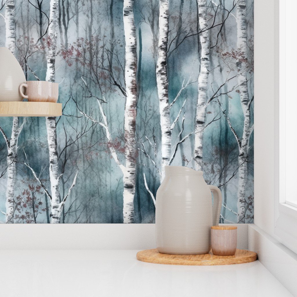 A serene birch tree dreamscape in misty teal and soft red tones, capturing the beauty of nature. Ideal for decor, textiles, or art projects.