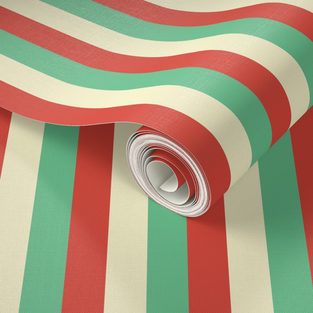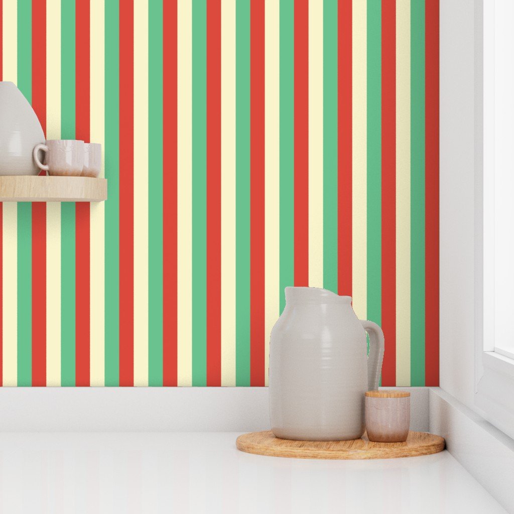 One inch wide tent stripes in red vermillion and green with yellow gold vintage Christmas stripes