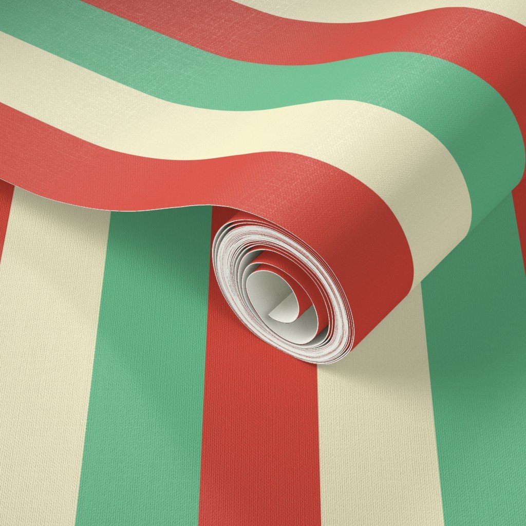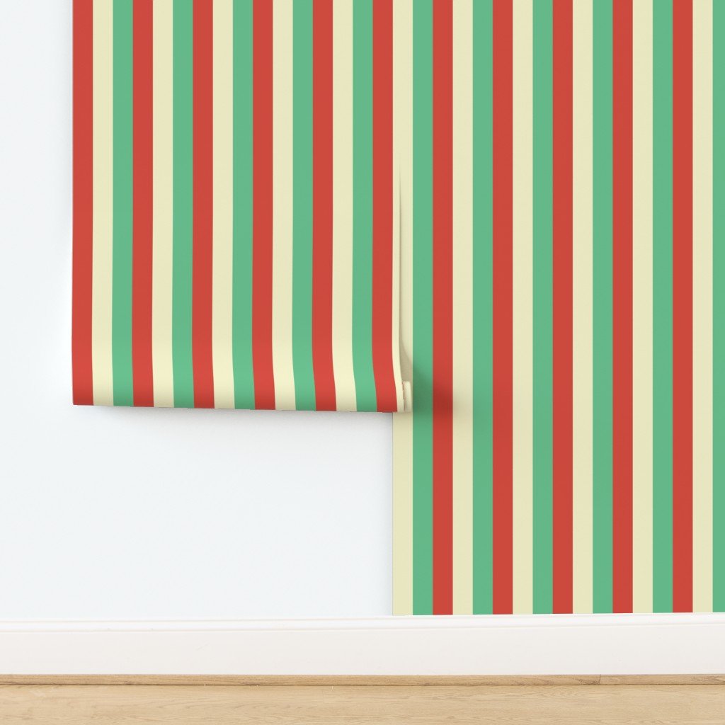 Large 2 inch wide tent stripes in red vermillion and green with yellow gold vintage Christmas stripes