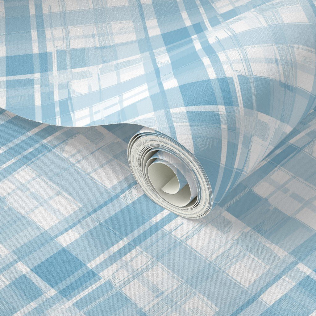 Faded pastel madras plaid on the diagonal in soft, faded pastel blue hues is perfect for adding a touch of elegance and charm