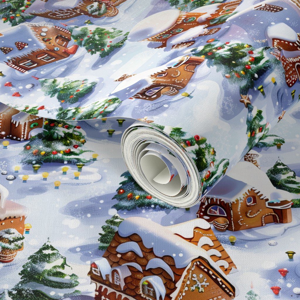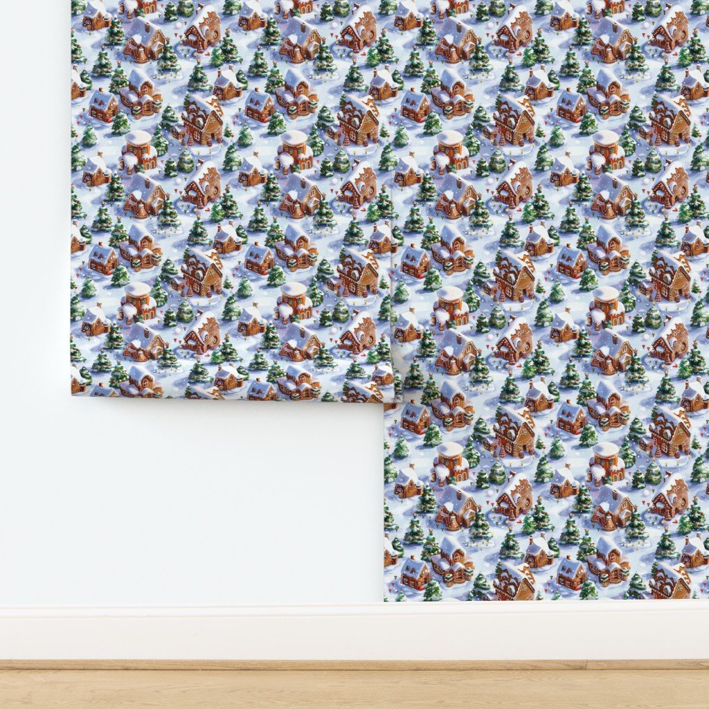 This delightful pattern showcases a festive gingerbread village set in a snowy landscape, featuring intricately decorated houses