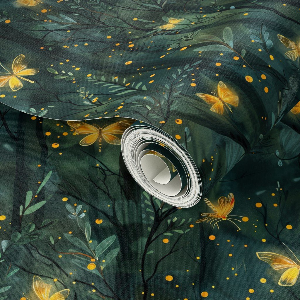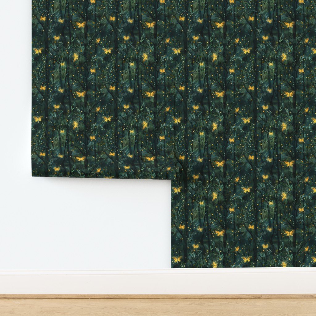 This enchanting pattern showcases a mystical forest bathed in the golden glow of fireflies and butterflies.