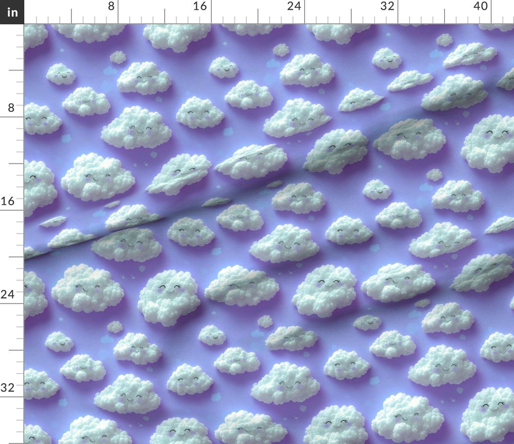Fluffy white clouds with smiling faces on a soft lavender background, adding a playful and cheerful touch to children’s room decor or baby showersSpecificationsFabric content: 100% CottonPrinted width: 42 inchesWeight: 4.4 oz/yd²Opacity: OpaqueConstruction: Plain WeaveShrinkage: 5-6% length x 2-3% widthThread count: 120Performance RatingsWyzenbeek (cotton duck abradant): 30,000 double rubs (ASTM D1457-13)Martindale: 20,000 cycles (ASTM 4966-22)Crocking dry (1 severe – 5 no color transfer): Exceeds 3 (AATCC TM 8)Crocking wet (1 severe – 5 no color transfer): Exceeds 3.5 (AATCC TM 8)Pilling (1 severe – 5 none): 4.5Note or Country of OriginCountry: Woven in IndonesiaPrinting: Digitally printed in the USA with water-based inksFabric backing: The backside of the fabric will be unprinted