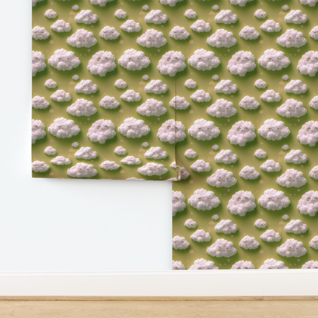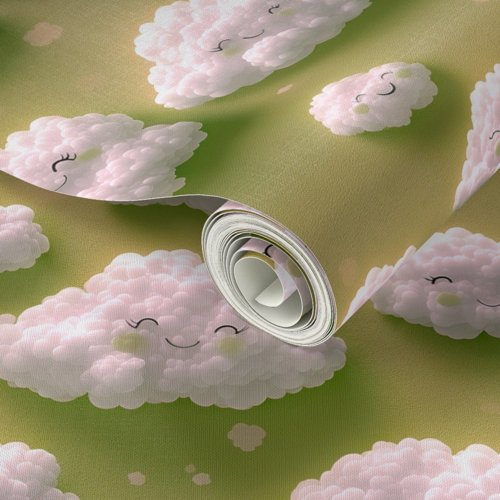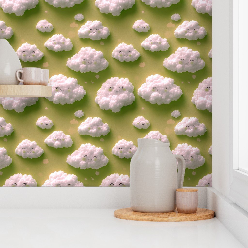 Fluffy white clouds with smiling faces float on a soft lime green background, adding a playful and cheerful touch, perfect for children’s room decor