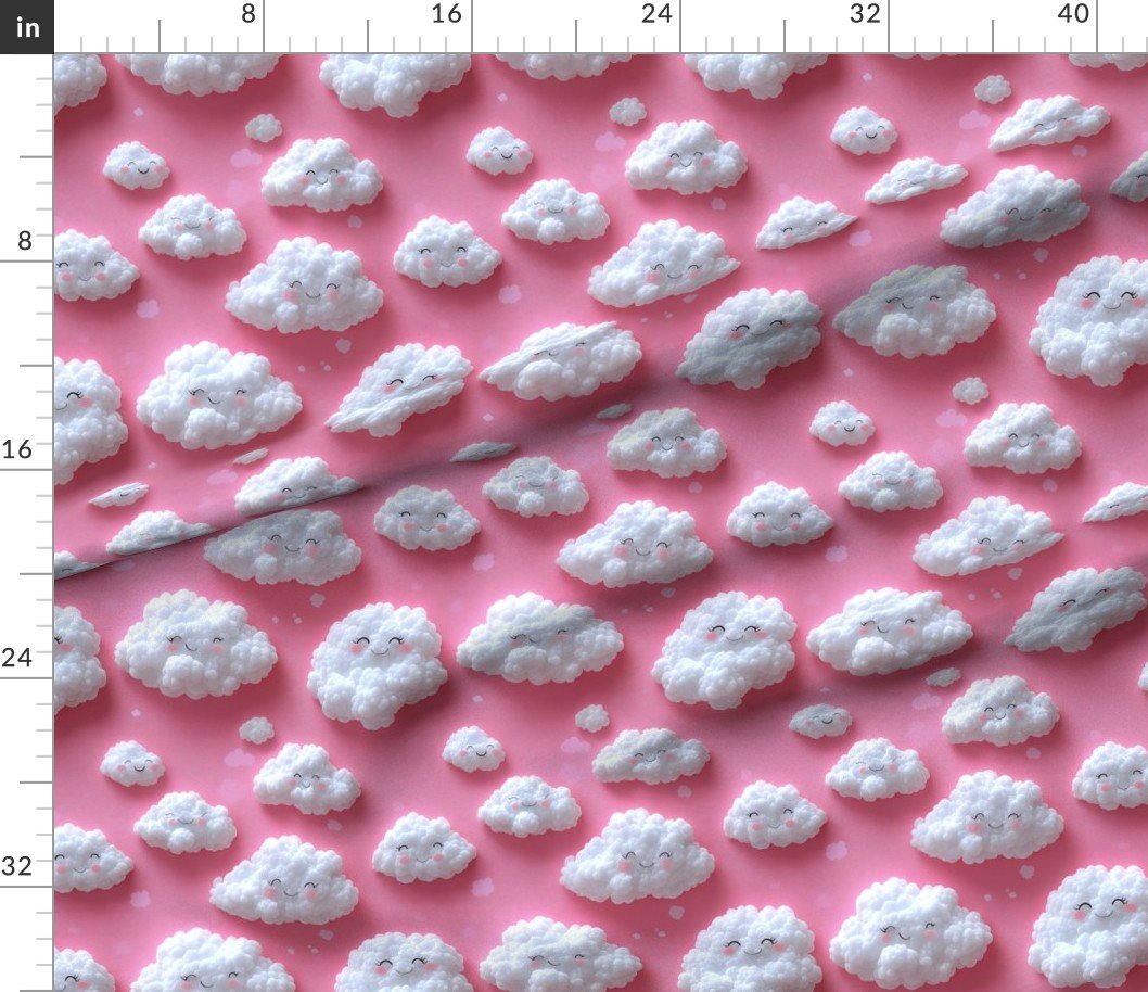 Fluffy white clouds with cute smiles drift on a soft pink background, making a cheerful and playful design ideal for children’s room decor.SpecificationsFabric content: 100% CottonPrinted width: 42 inchesWeight: 4.4 oz/yd²Opacity: OpaqueConstruction: Plain WeaveShrinkage: 5-6% length x 2-3% widthThread count: 120Performance RatingsWyzenbeek (cotton duck abradant): 30,000 double rubs (ASTM D1457-13)Martindale: 20,000 cycles (ASTM 4966-22)Crocking dry (1 severe – 5 no color transfer): Exceeds 3 (AATCC TM 8)Crocking wet (1 severe – 5 no color transfer): Exceeds 3.5 (AATCC TM 8)Pilling (1 severe – 5 none): 4.5Note or Country of OriginCountry: Woven in IndonesiaPrinting: Digitally printed in the USA with water-based inksFabric backing: The backside of the fabric will be unprinted