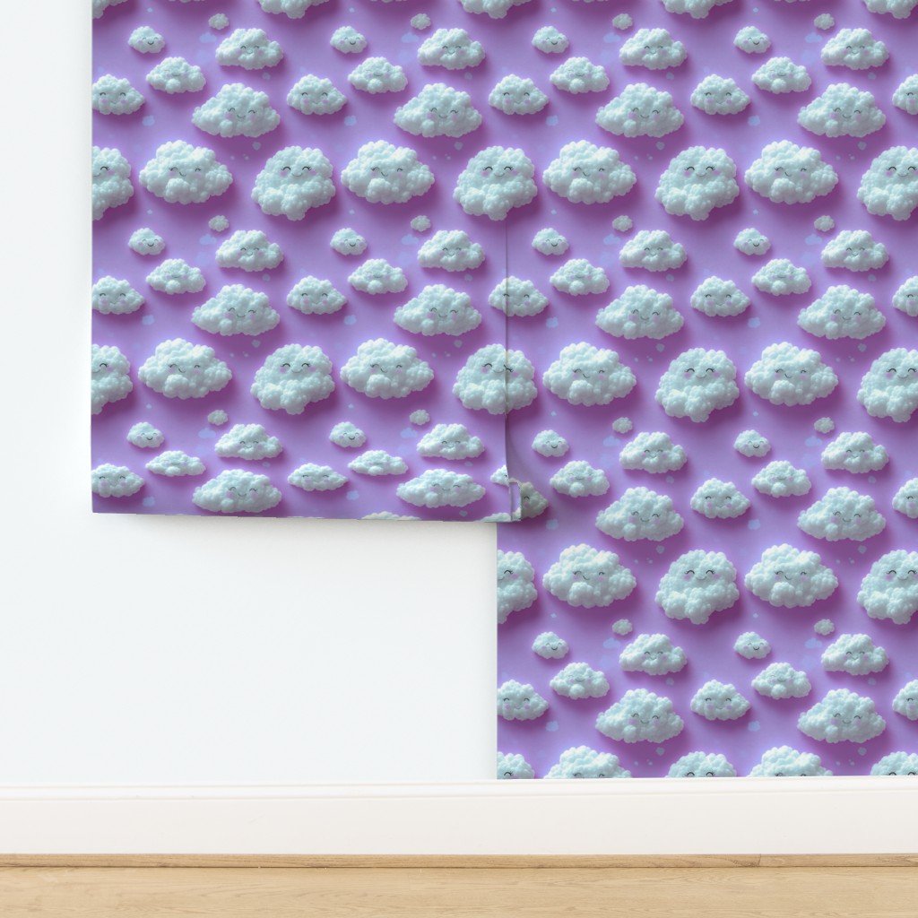 Fluffy white clouds with smiling faces float on a pink lavender background, adding a playful and cheerful touch to children’s room decor, baby shower